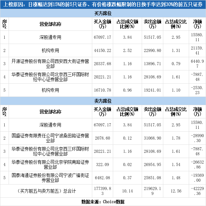 今日龙虎榜单上出现了深股通的身影,占据了买一、卖一的位置,净买入1.56亿元,占当日成交总额的0.89%,是获深股通净买额最高的个股。除此之外深股通还参与到了中超控股、通宇通讯、利欧股份等21只个股中,其中12家呈现深股通净买入,获净买入最多的是利欧股份,净买额为1.35亿元;9家呈现深股通净卖出,遭净卖出最高的为中超控股,净卖额为1.78亿元。
