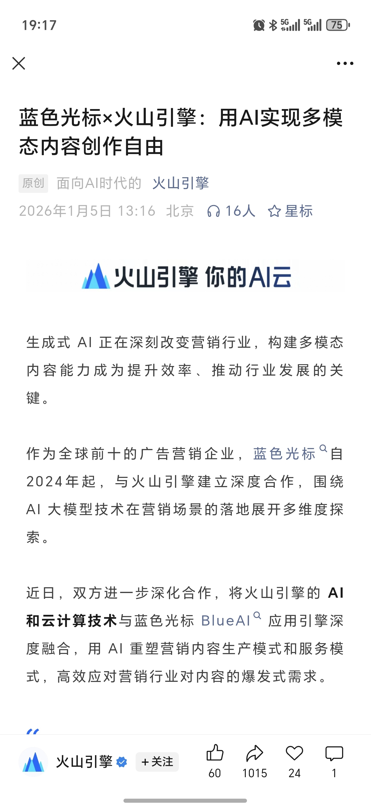 $蓝色光标(SZ300058)$ 官宣了,火山引擎蓝色光标