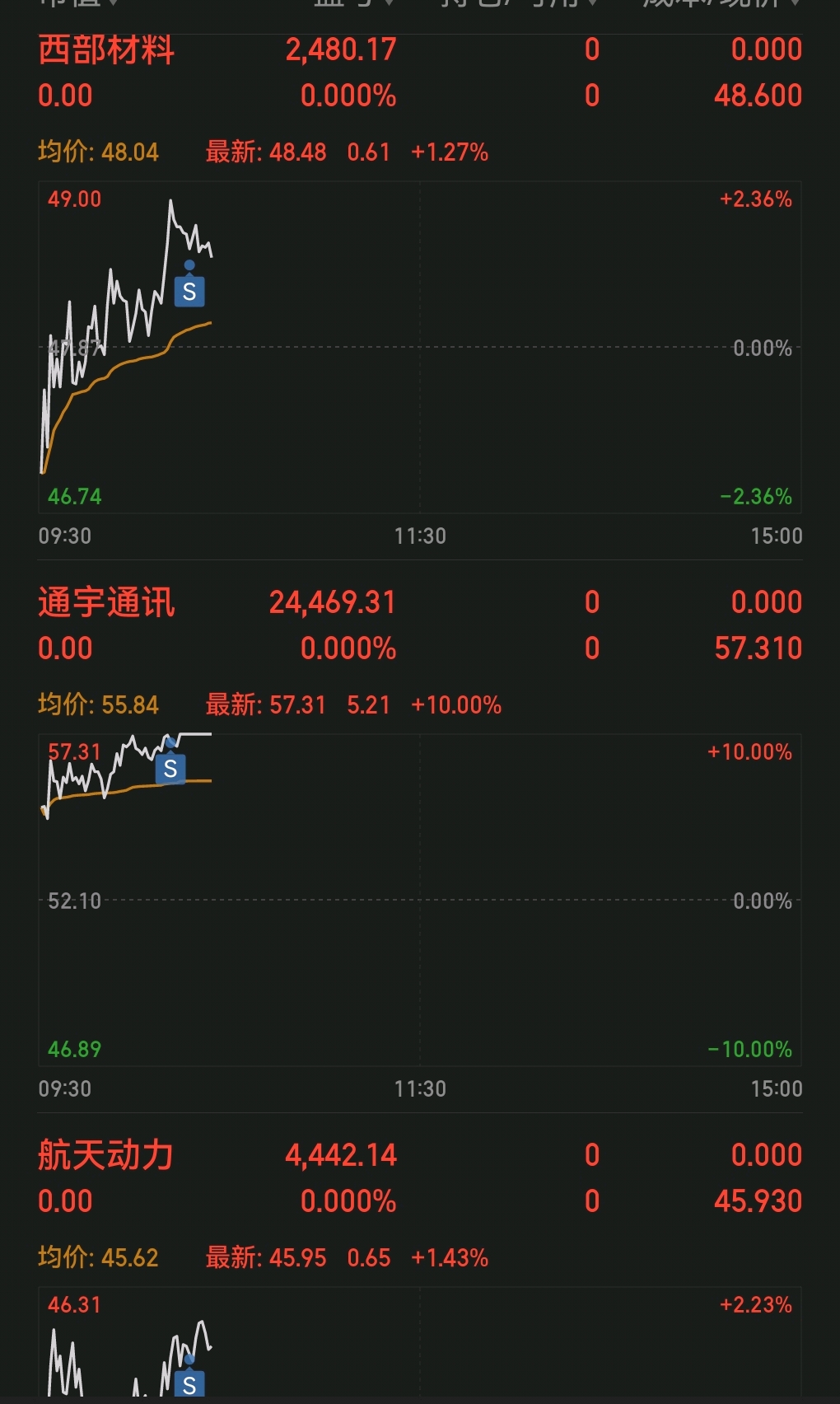 今日继续优化持仓结构,果断兑现航天动力、西部材料、通宇通讯的收益落袋为安;