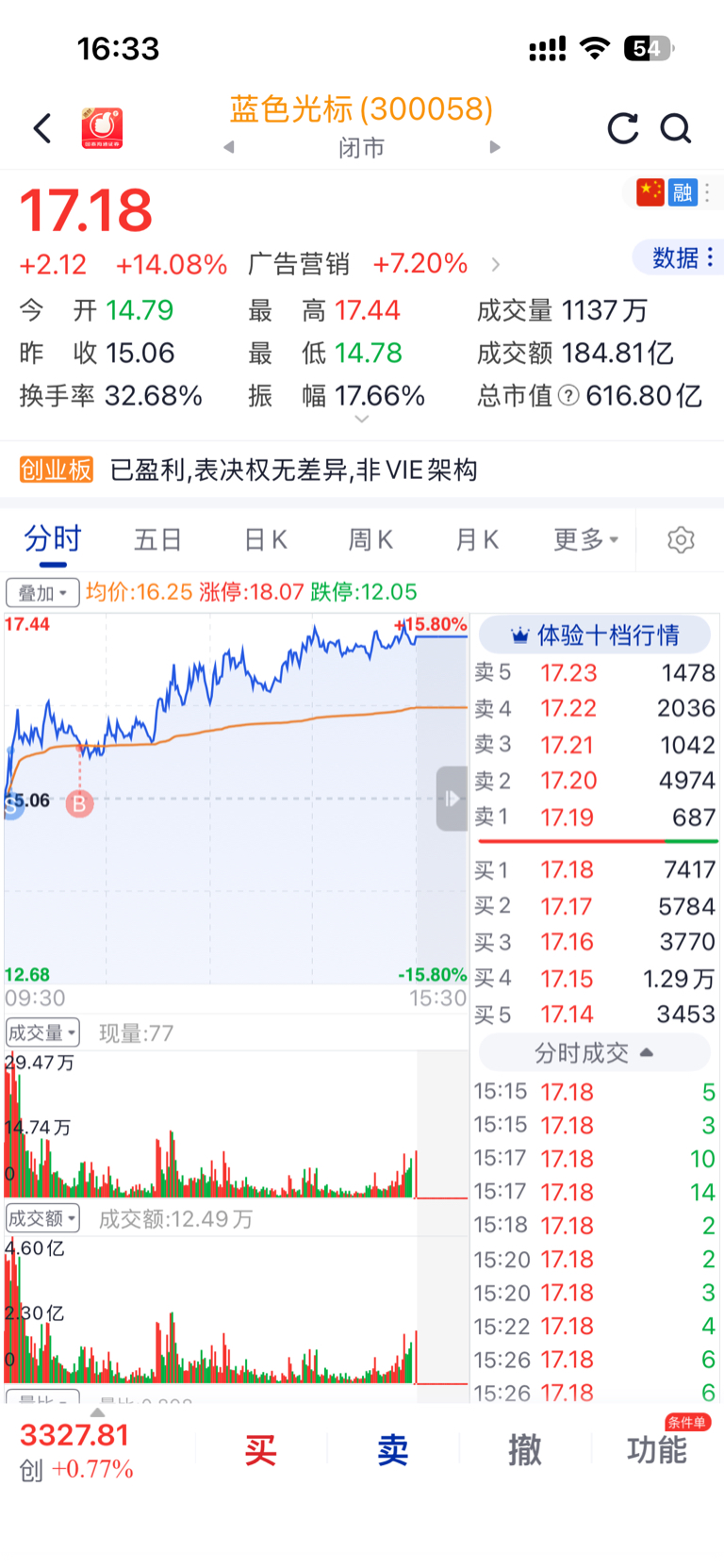 $蓝色光标(SZ300058)$ 卖飞了 又接回来了,还好接回,不然大腿要拍肿
