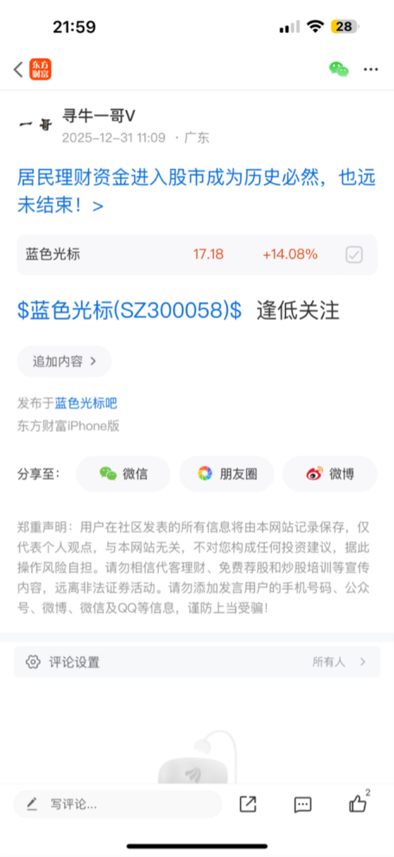 温馨提示: 1.根据《证券法》规定,禁止编造、传播虚假信息或者误导性信息,扰乱证券市场;2.用户在本社区发表的所有资料、言论等仅代表个人观点,与本网站立场无关,不对您构成任何投资建议。用户应基于自己的独立判断,自行决定证券投资并承担相应风险。《东方财富社区管理规定》