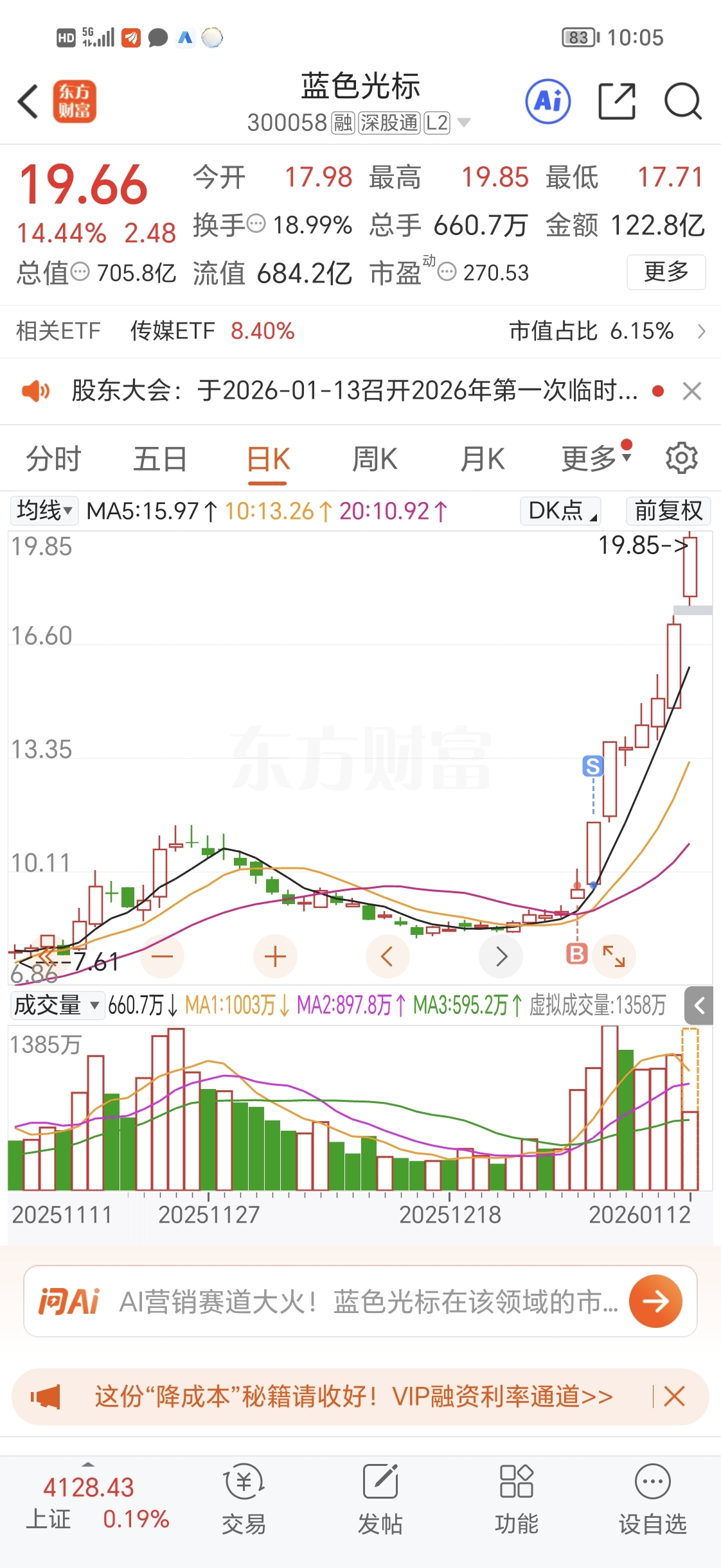 $蓝色光标(SZ300058)$ 周末我一直在想易点天下会不会和蓝色一样我卖了就起飞。没想到又是卖在起爆点。章盟主真的同车次数太多,大多数不卖就跳水,这次我也知道不一样,竞价很多传媒票一字涨停。我不知道为什么明明知道不该卖,有一股魔力还是没忍住卖了。