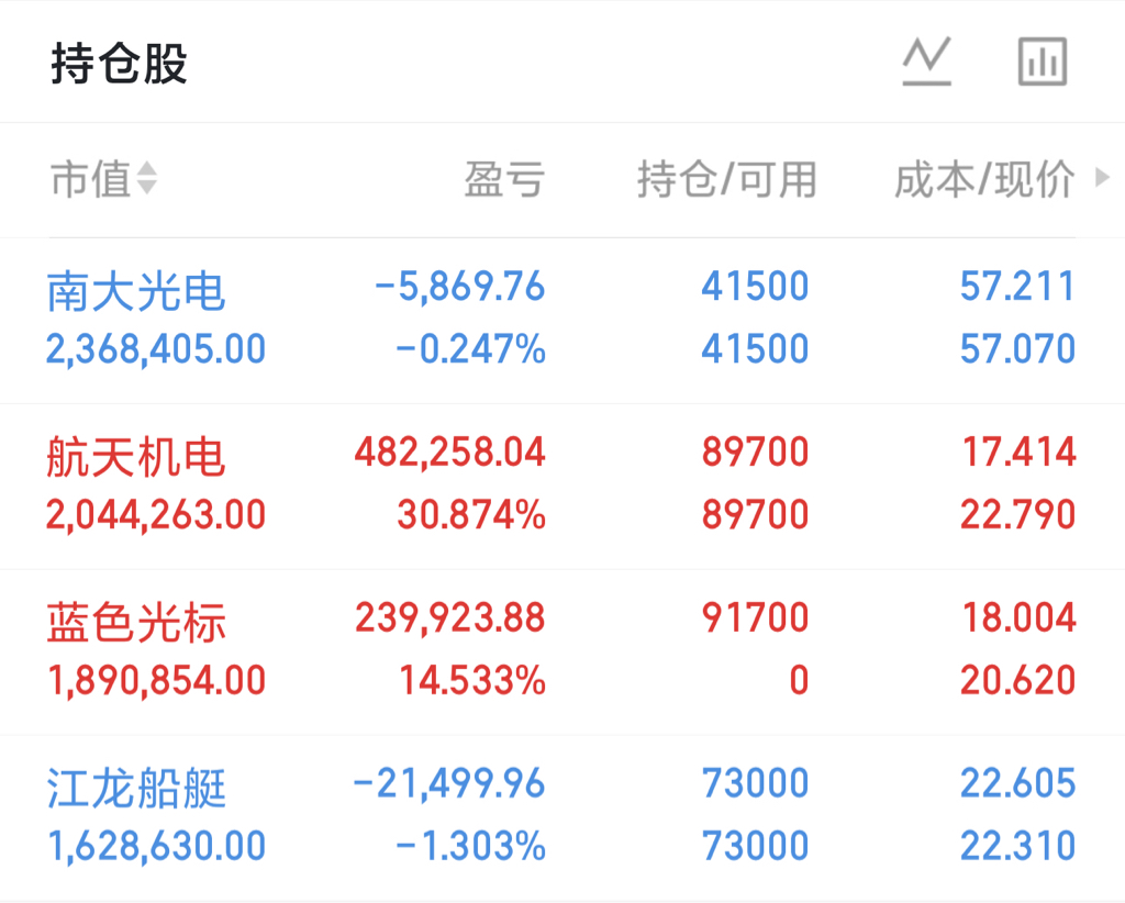 $蓝色光标(SZ300058)$ 早盘介入成功顶住压力晋级成功$航天机电(SH600151)$ 商业航天强势再次涨停,继续格局$江龙船艇(SZ300589)$ 板块回暖静待花开,南大震荡阶段