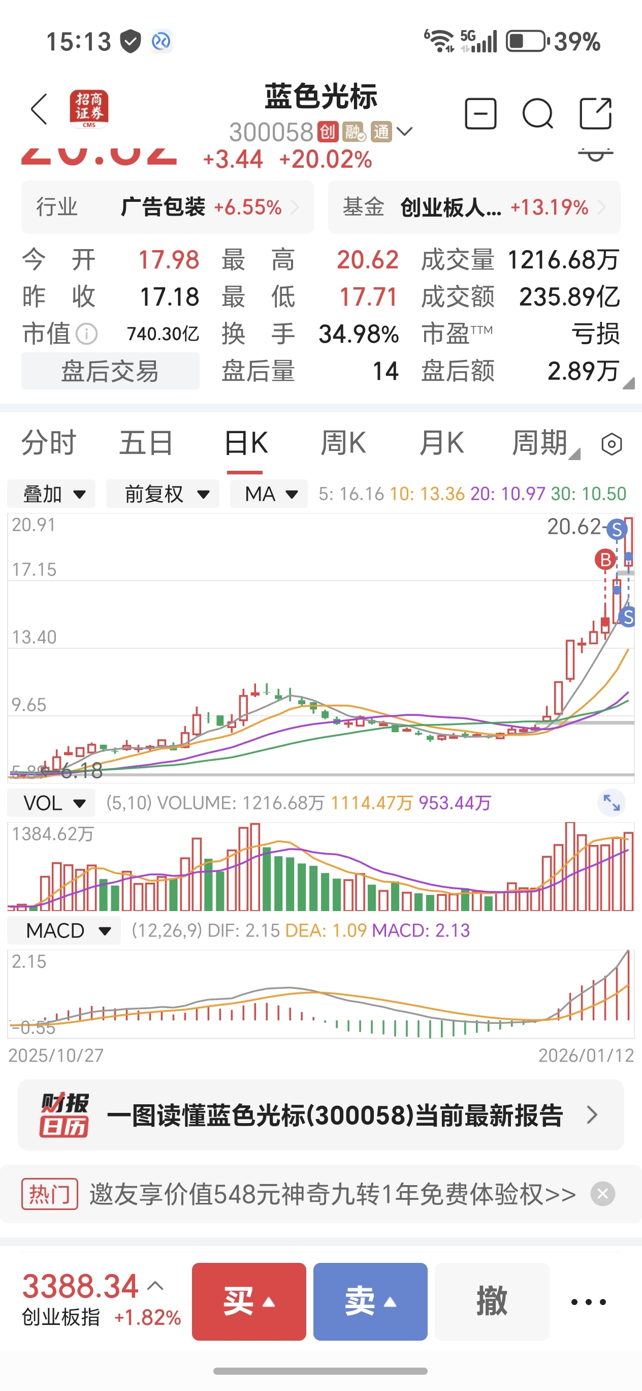 $蓝色光标(SZ300058)$ 今天第二次炸板的时候出完了,周五就不应该卖,没想到 ai这么强。尾盘买了低位的光环新网。担心蓝色光标进监管,老股民不适合这种行情了,一卖就飞。啥时候吃过这么大的成交量
