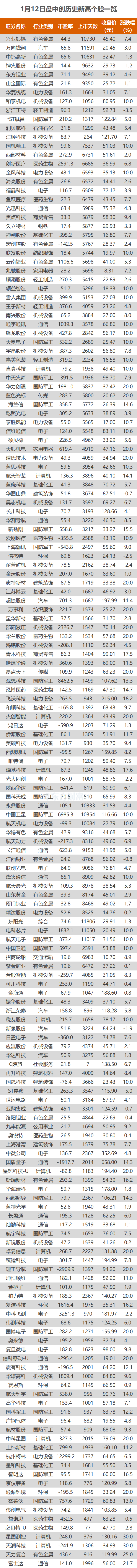 1月12日,A股三大指数今日继续强势表现,沪指日线17连阳再创逾十年新高。截止收盘,沪指涨1.09%,收报4165.29点;深证成指涨1.75%,收报14366.91点;创业板指涨1.82%,收报3388.34点。东方财富Choice数据显示,今日有172只个股盘中股价创历史新高,分别为蓝色光标、金风科技等。