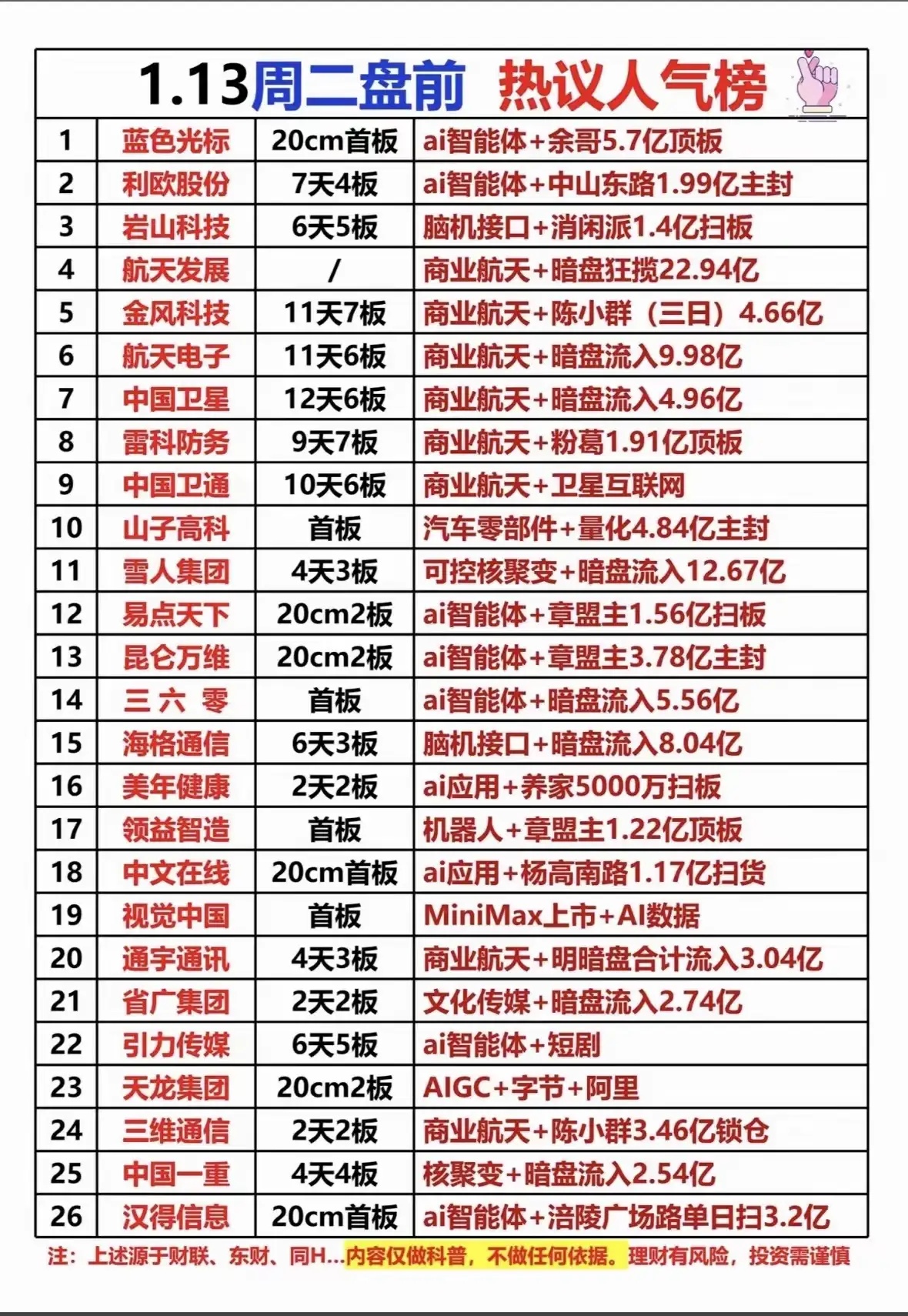 1月13号,周二,盘前热议人气榜1月13号,周二,作业方向前瞻!潜力股推荐中泰股