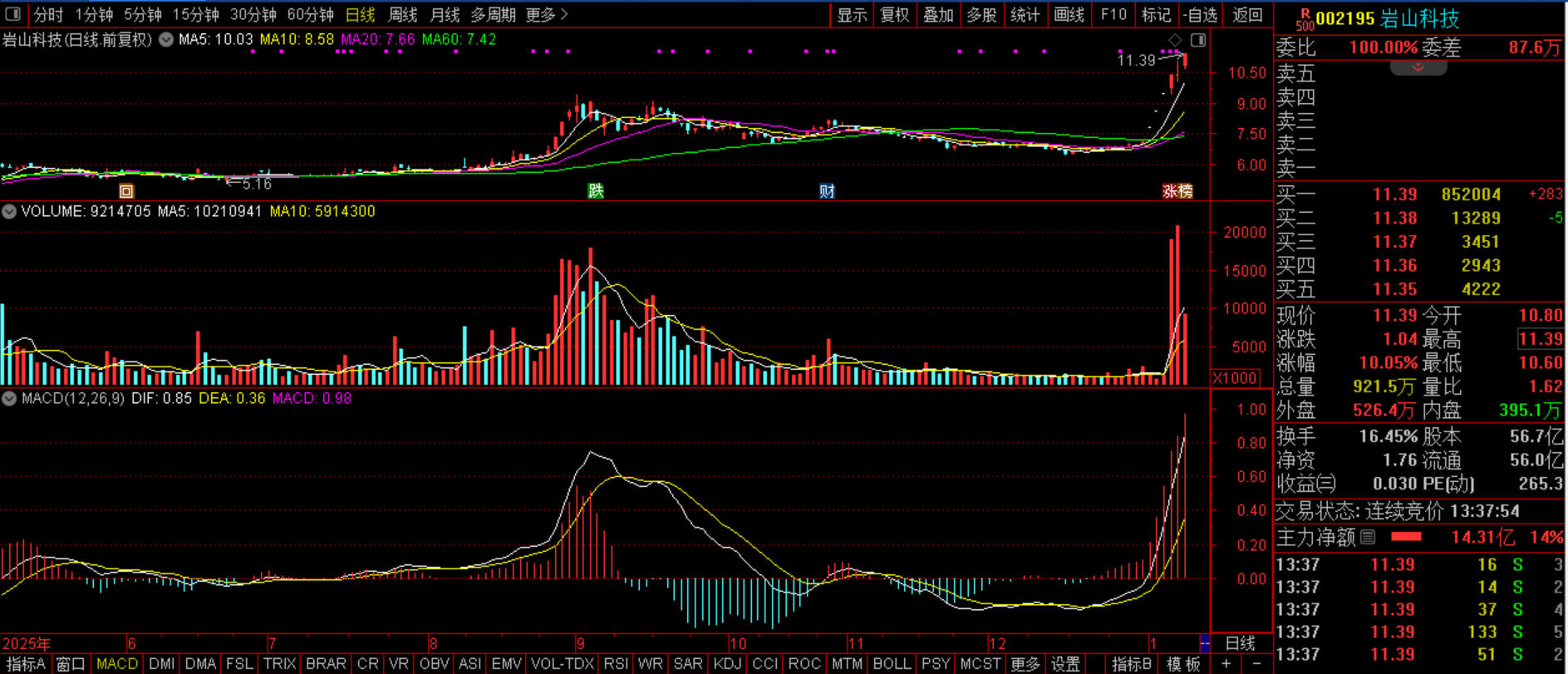 岩山科技(SZ002195):脑机接口+Yan大模型+人形机器人+AI应用。昨日此股大幅高开略探底然后快速拉涨封板股价再新高,这是趋势的强化,复盘时说了,该股紫金承接良好。而量能大幅萎缩,侧面印证了该股猪力筹码相对集中,通过前两日的强震,可能已经换手足够,因此笔者调高该股后市预期,后市股价创历史大概率。预计今日此股有望继续走高,由于11.50--14.26是该股的强阻力区,因此这个位置可能仍有强震,不过果真这样的话,可能仍是机遇,值得尝试开干。