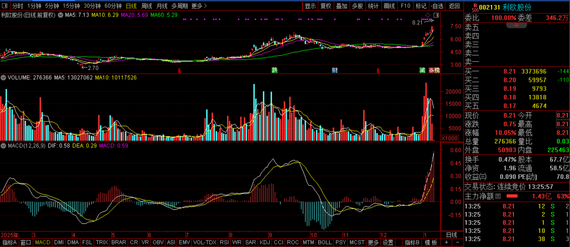 利欧股份(SZ002131):AI智能体+液冷服务器+机械制造+扭亏为盈++核电泵+液冷泵。昨日此股一字板开盘,期间并未炸板,这是典型的突破的确认,料后市新的上涨行情开启。预计今日该股有望继续走高,8.70--9.40是此股的强阻力区,9.40更是该股的历史最高价,因此这个位置可能会稍有震荡,如能顺利突破的话,后市或加速走出新的上涨行情。料今日该股有望继续走高,甚至再板,如果盘中分歧走水的话,依旧是机遇多于风险,值得考虑研究。当然能否快速拉涨,还得紫金流入以及大势配合。