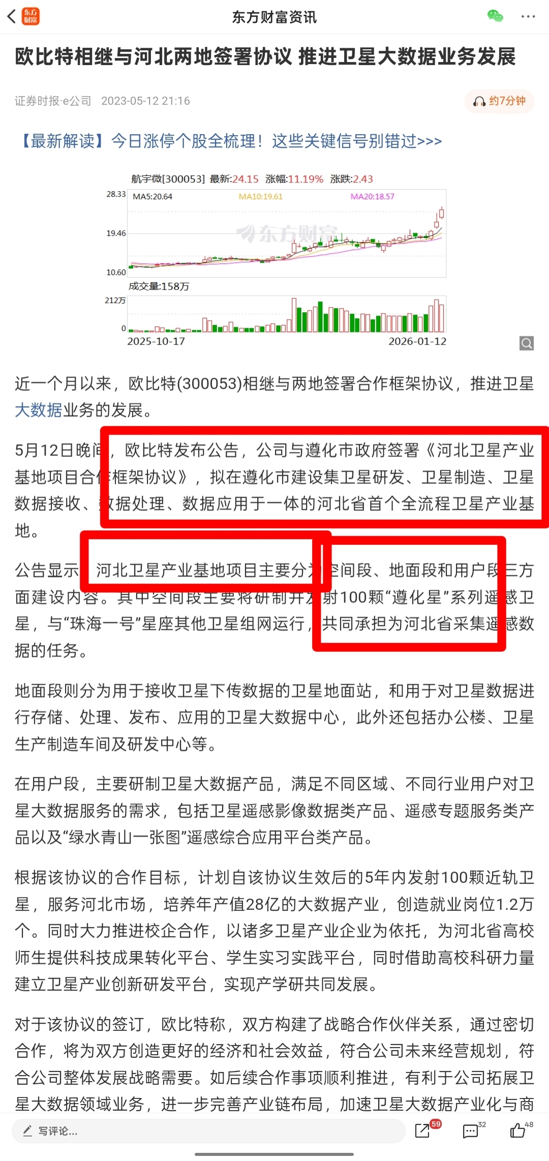 $三维通信(SZ002115)$ $岩山科技(SZ002195)$ $航宇微(SZ300053)$ 牛 国家河北卫星制造基地其实是航宇微建的,牛bi吧接上文项目包括空间段建设、地面段建设+用户段建设。合作目标为建设集卫星研发、卫星制造、卫星数据接收、数据处理、数据应用于一体国家级河北省首个全流程卫星产业基地