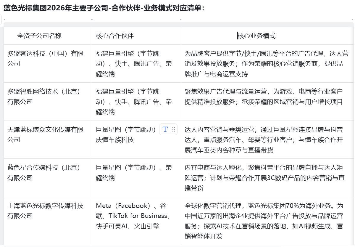 蓝色光标2026年主要子公司、全球及国内核心合作伙伴、业务合作模式分享,请参考!