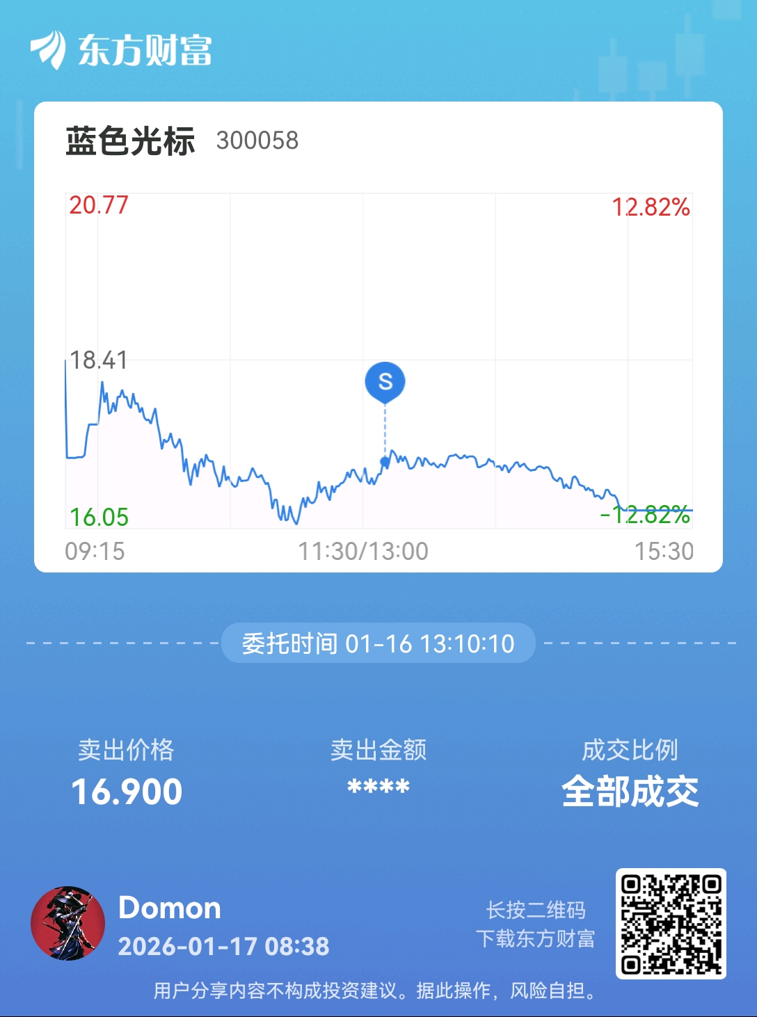 温馨提示: 1.根据《证券法》规定,禁止编造、传播虚假信息或者误导性信息,扰乱证券市场;2.用户在本社区发表的所有资料、言论等仅代表个人观点,与本网站立场无关,不对您构成任何投资建议。用户应基于自己的独立判断,自行决定证券投资并承担相应风险。《东方财富社区管理规定》