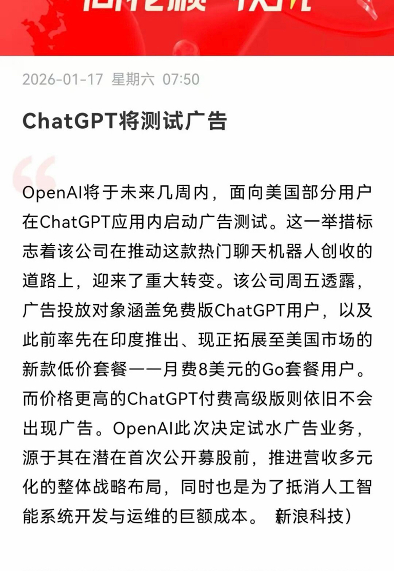 OpenAI本周末宣布--ChatGPT将进行广告推送