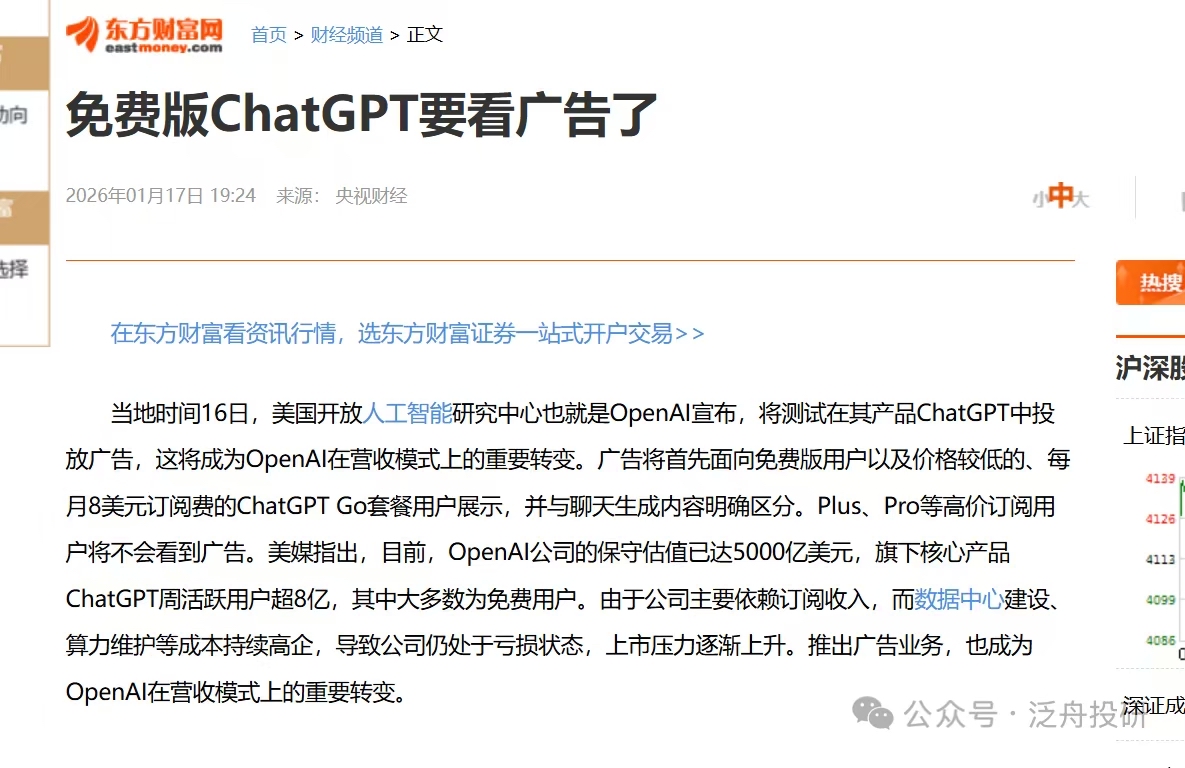 OpenAI的广告业务需依赖精准的广告投放技术和营销服务。沪深股市中,从事广告技术平台、数据营销服务的公司可能受益,如蓝色光标(营销服务与广告技术提供商)、引力传媒(数字营销与广告投放服务提供商)等。这些公司可为OpenAI的广告业务提供技术支持或合作机会。