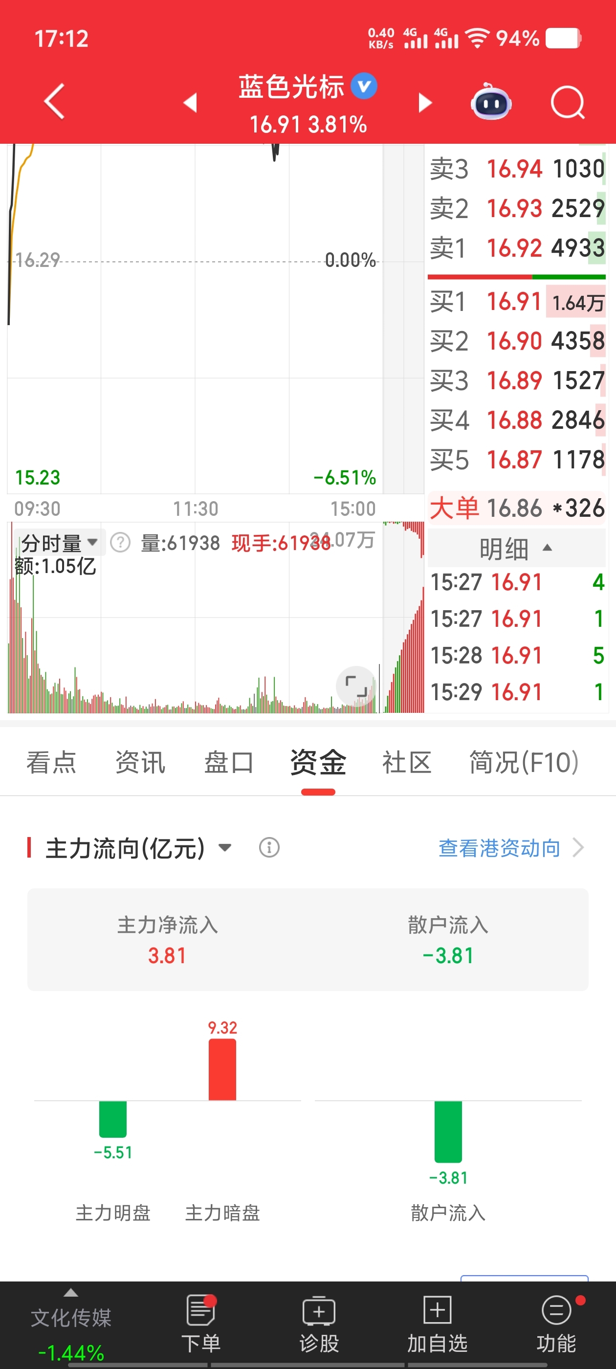 $蓝色光标(SZ300058)$ 今天有吓跑的吗?暗盘资金出来了。