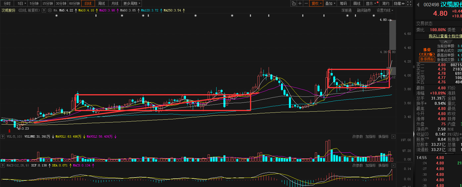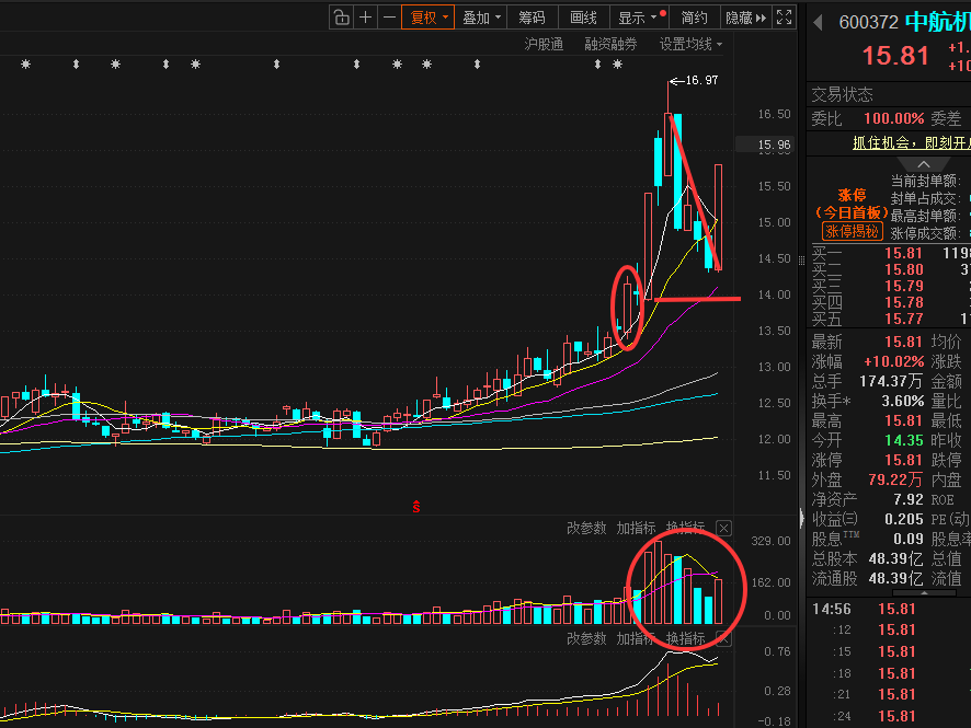 策略上,早盘不能出现放量跳水,收盘不能出现放大量收长上影线,出现则需考虑高减。就看今天能否继续给到涨停。
