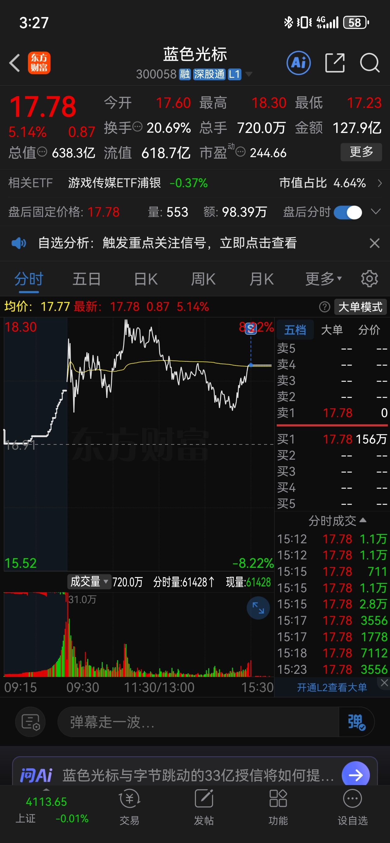 $蓝色光标(SZ300058)$ 冲高回落,最后拉尾盘,明天肯定低开了,我尾盘卖了,等明天砸下来接回