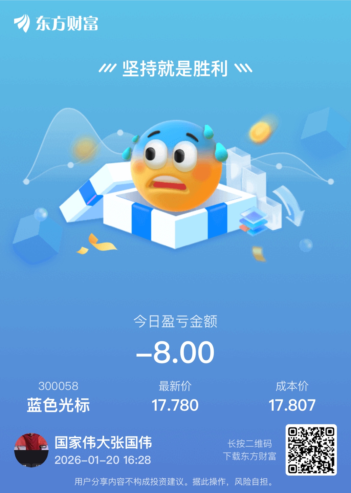 温馨提示: 1.根据《证券法》规定,禁止编造、传播虚假信息或者误导性信息,扰乱证券市场;2.用户在本社区发表的所有资料、言论等仅代表个人观点,与本网站立场无关,不对您构成任何投资建议。用户应基于自己的独立判断,自行决定证券投资并承担相应风险。《东方财富社区管理规定》