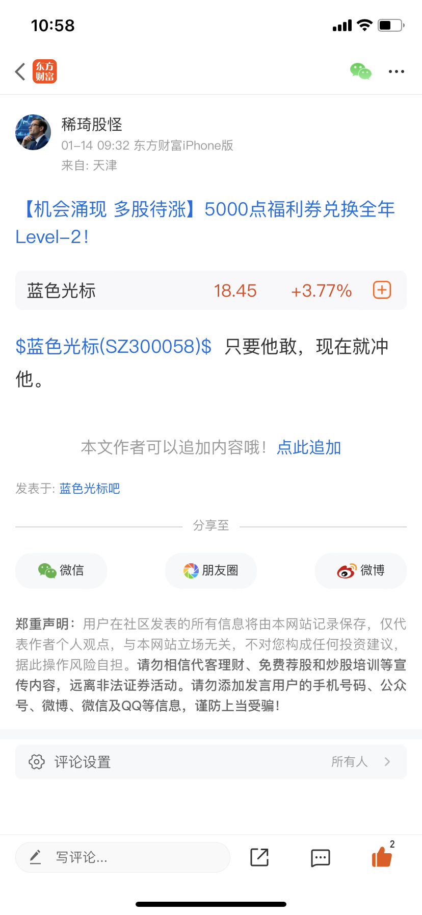 温馨提示: 1.根据《证券法》规定,禁止编造、传播虚假信息或者误导性信息,扰乱证券市场;2.用户在本社区发表的所有资料、言论等仅代表个人观点,与本网站立场无关,不对您构成任何投资建议。用户应基于自己的独立判断,自行决定证券投资并承担相应风险。《东方财富社区管理规定》