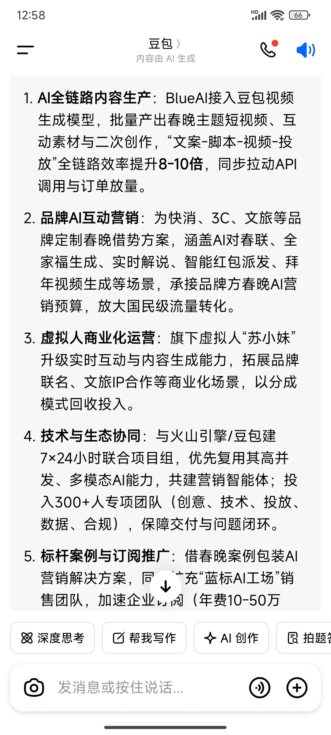 蓝色光标并非2026年央视春晚官方直接合作方,而是作为火山引擎(春晚独家AI云合作伙伴)的核心营销伙伴,承接豆包大模型相关AI营销预算与内容服务,核心是全链路AI内容生产、品牌互动营销、虚拟人商业化与技术协同。具体工作如下: