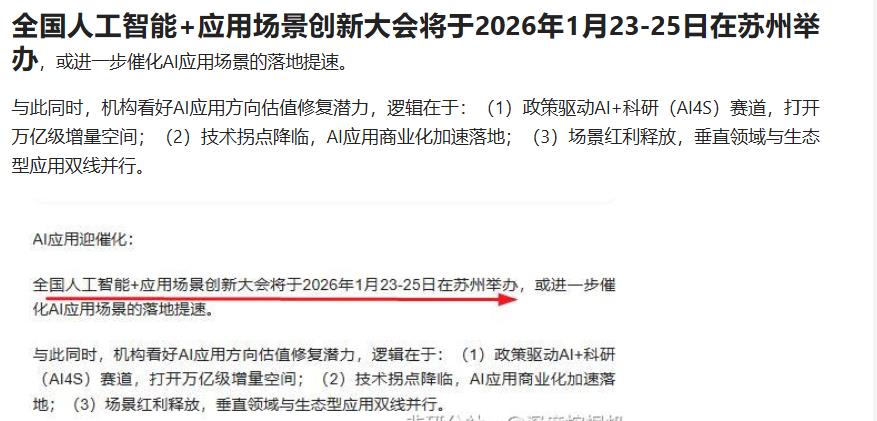 AI应用本周迎催化:全国人工智能+应用场景创新大会将于2026年1月23-25日在苏州举办,或进一步催化AI应用场景的落地提速。蓝色光标$引力传媒(SH603598)$ $人民网(SH603000)$ $三维通信(SZ002115)$ 浙文互联