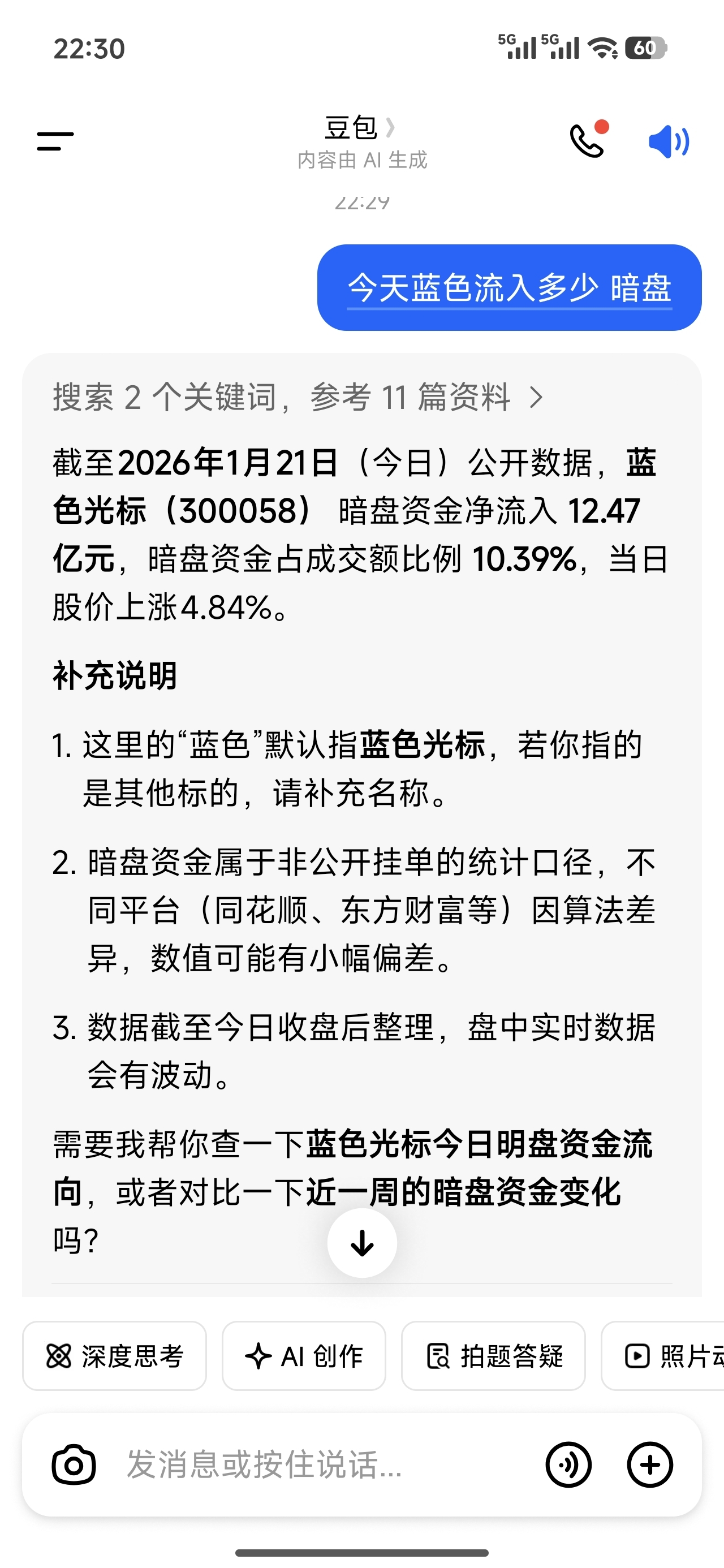 $蓝色光标(SZ300058)$ 问了豆包今天暗盘流入这么多