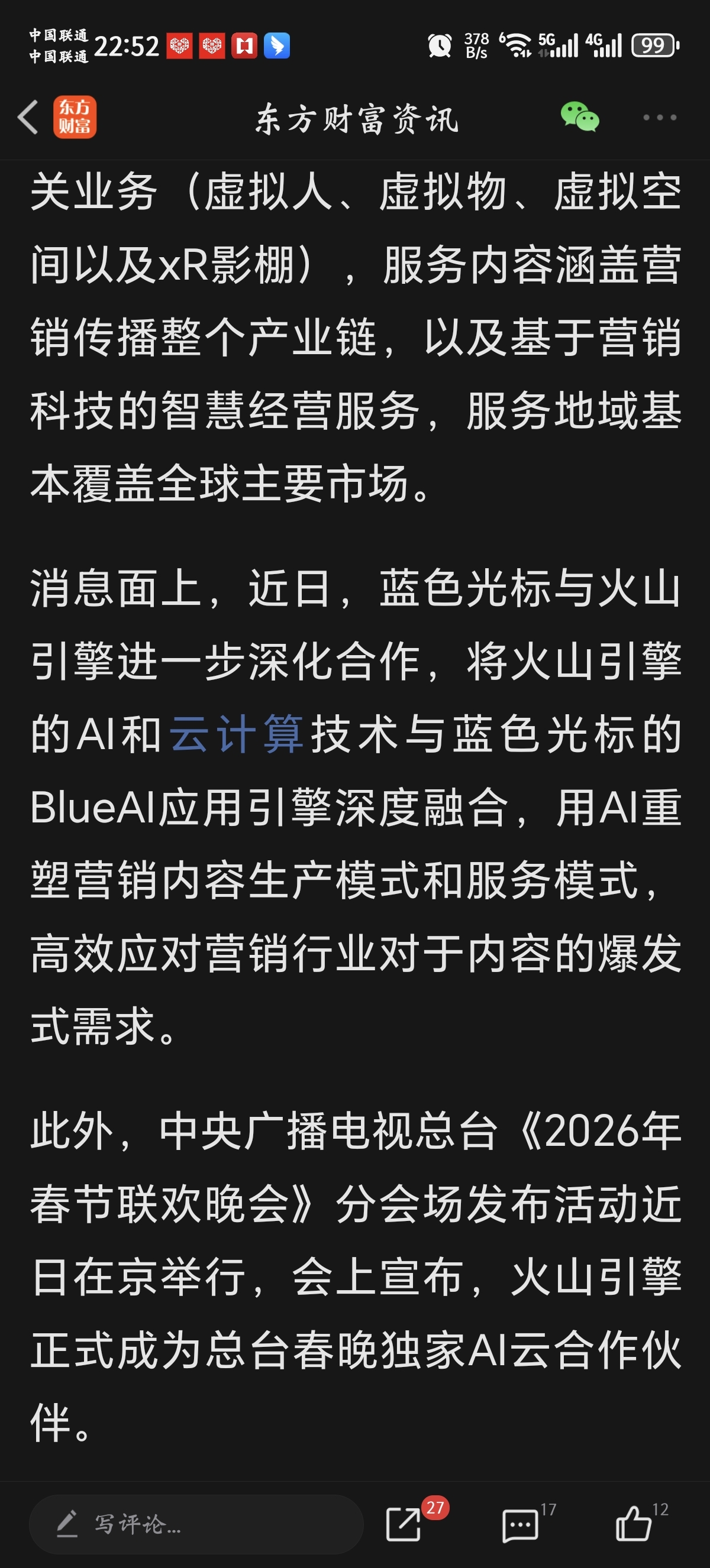 $蓝色光标(SZ300058)$ 春晚是全国人民的,隔壁春晚的机器人开始躁动了。牛回头,带车接人!春节前只买不卖~~~~