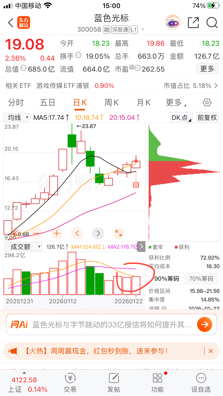 $蓝色光标(SZ300058)$ 虽然冲高回落,但是全天洗盘形态良好,而且成交量也略微放大了,不至于承接太弱,连续几天上涨加上之前的套牢盘有冲高回落实属正常,只要后面保持住冲锋姿态就行