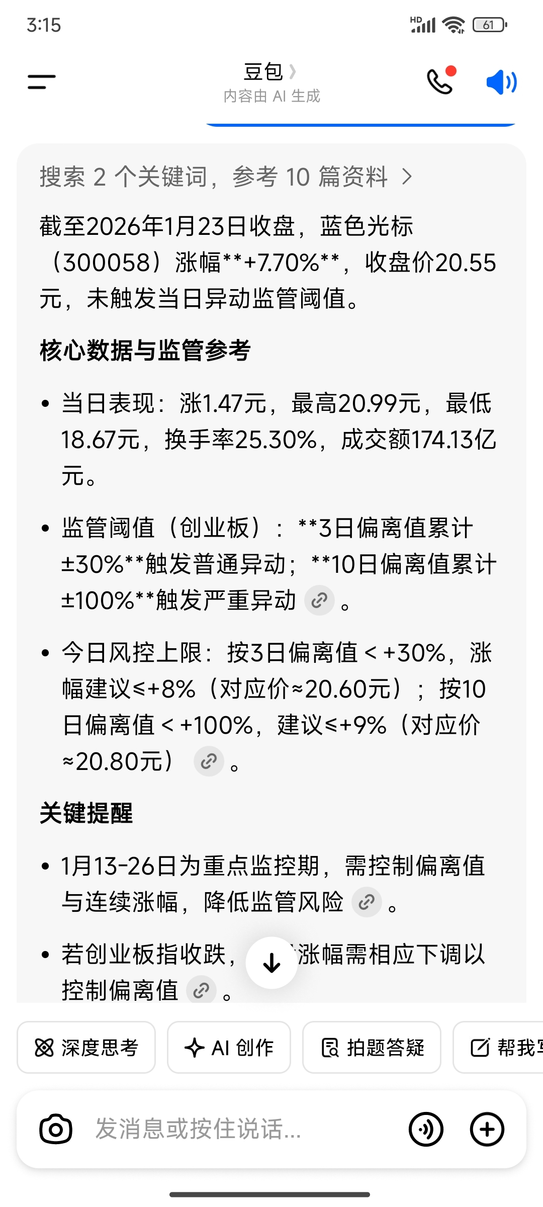 $蓝色光标(SZ300058)$ 截至2026年1月23日收盘,蓝色光标(300058)涨幅**+7.70%**,收盘价20.55元,未触发当日异动监管阈值。