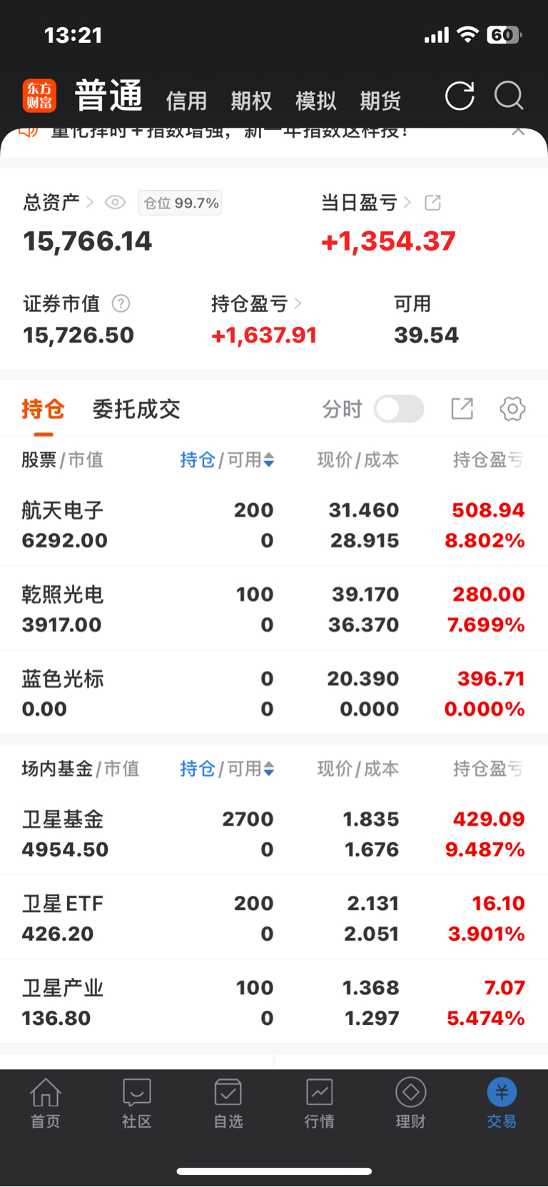 左手中国国务院航天电子右手马斯克太空龙头乾照光电外加卫星ETF跟上国家队今天赚了1354个