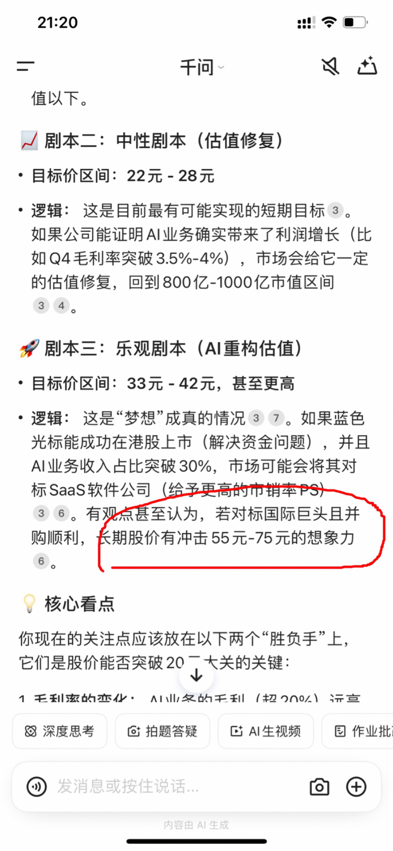 $蓝色光标(SZ300058)$ 千问说能涨到75