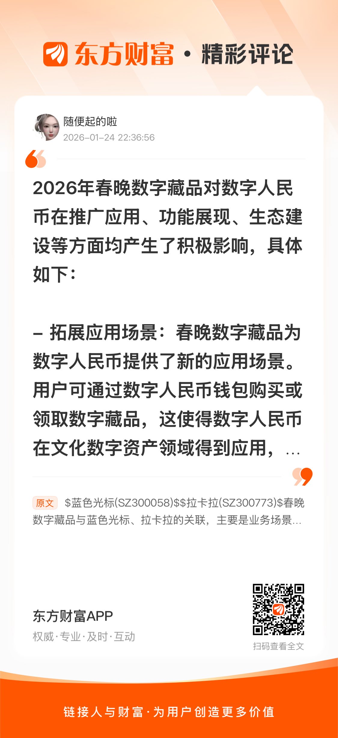 $蓝色光标(SZ300058)$ $拉卡拉(SZ300773)$ 春晚数字藏品与蓝色光标、拉卡拉的关联,主要是业务场景的潜在合作可能,但目前暂无直接业务绑定,具体分析: 1. 与蓝色光标的关联:AI营销+IP数字营销的潜在协同 蓝色光标的核心业务是“营销服务+AI营销工具”,而春晚数字藏品属于“IP数字文创营销”场景: - 潜在合作方向:蓝色光标可能参与春晚数字藏品的营销推广、内容衍生(比如用其AI工具制作数字藏品的配套营销内容、虚拟直播带货);- 现状:目前蓝色光标未公开与2026春晚数字藏品的合作信息,仅属于同赛道(数字营销)的潜在关联。 2. 与拉卡拉的关联:支付结算的潜在支持 拉卡拉是第三方支付机构,而数字藏品的购买需要合规支付渠道: - 潜在合作方向:拉卡拉可能为春晚数字藏品的购买提供支付结算服务(比如接入其支付接口,支持用户用银行卡/数字人民币购买);- 现状:拉卡拉暂未公告参与春晚数字藏品的支付合作,仅属于支付领域的潜在配套方。 简言之:两者与春晚数字藏品目前没有直接业务关联,仅存在“数字营销/支付结算”场景下的潜在合作可能性。