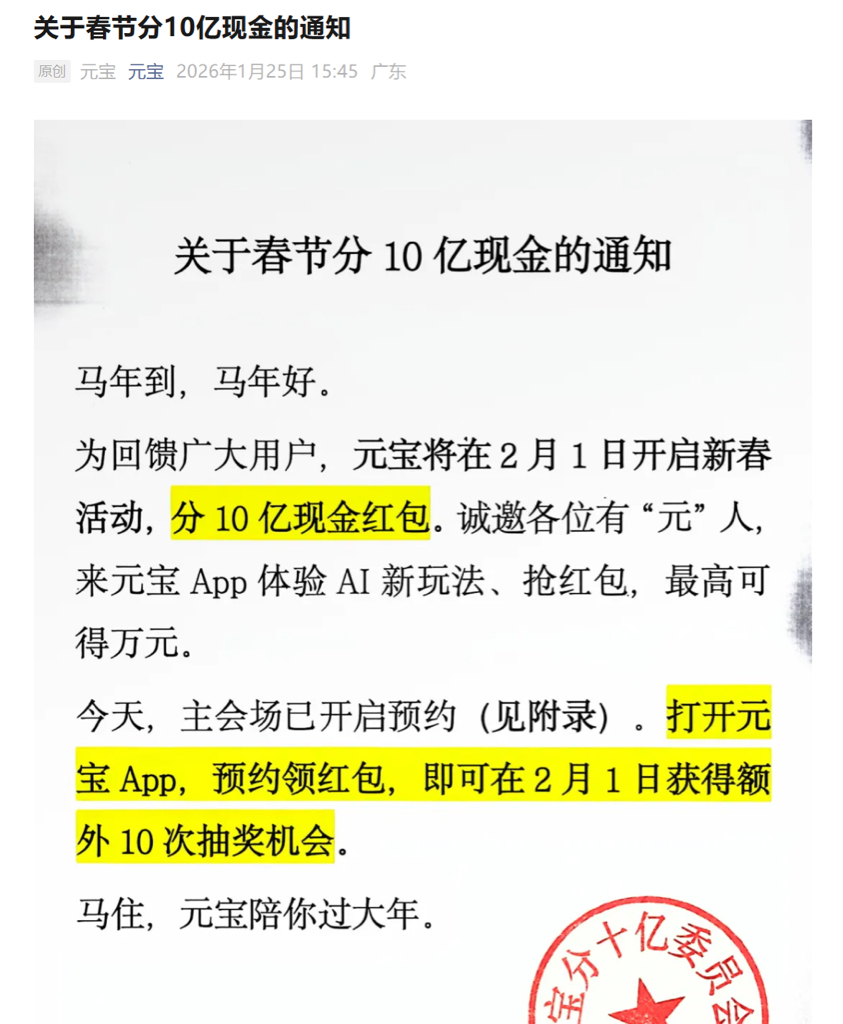 1月25日,腾讯元宝发布通知,将在2月1日开启新春活动,分10亿现金红包,单个红
