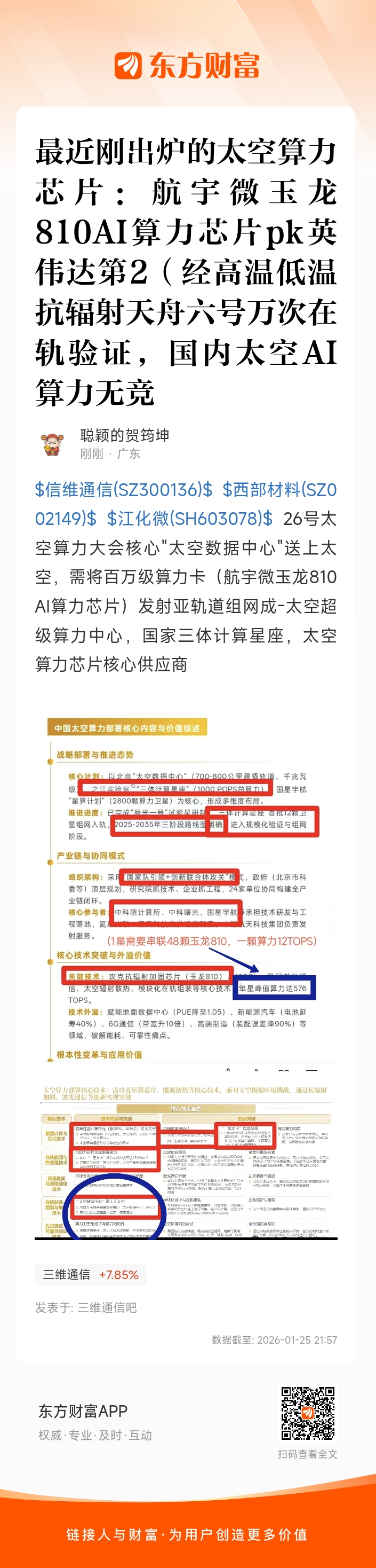 $蓝色光标(SZ300058)$$蓝思科技(SZ300433)$$通宇通讯(SZ002792)$航宇微300053玉龙AI芯片(太空算力芯片)已进入国家太空算力网(目前玉龙810,后续升级版910在轨验证后量产)(太空算力引擎):玉龙810A算力12TOPS、功耗<6W(能效比2TOPS/W),“一星多卡”集群可至576TOPS(需要串联48颗玉龙810,一颗算力12TOPS,中科院计算所采用类似地面服务器的思路。在单颗卫星上搭载多枚航宇微玉龙810AI芯片组成算力集群),星上处理将传输成本降85%,单景船舶检测仅7秒。妥妥的太空英伟达,目前英伟达还没做到太空算力芯片,经高温低温抗辐射,天舟六号万次在轨验证;国内唯一,无竞争者,独一份