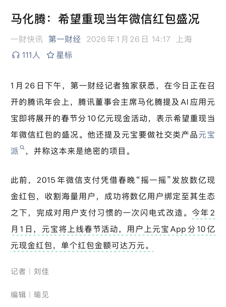 $蓝色光标(SZ300058)$ $润泽科技(SZ300442)$ 今年过年应该是要热闹一波了,不过已经从阿里微信大战变成了两个主要玩家抖音(豆包)和腾讯(元宝)之间的争夺,所以蓝色光标和润泽科技都有机会,现在就是等继续发酵。