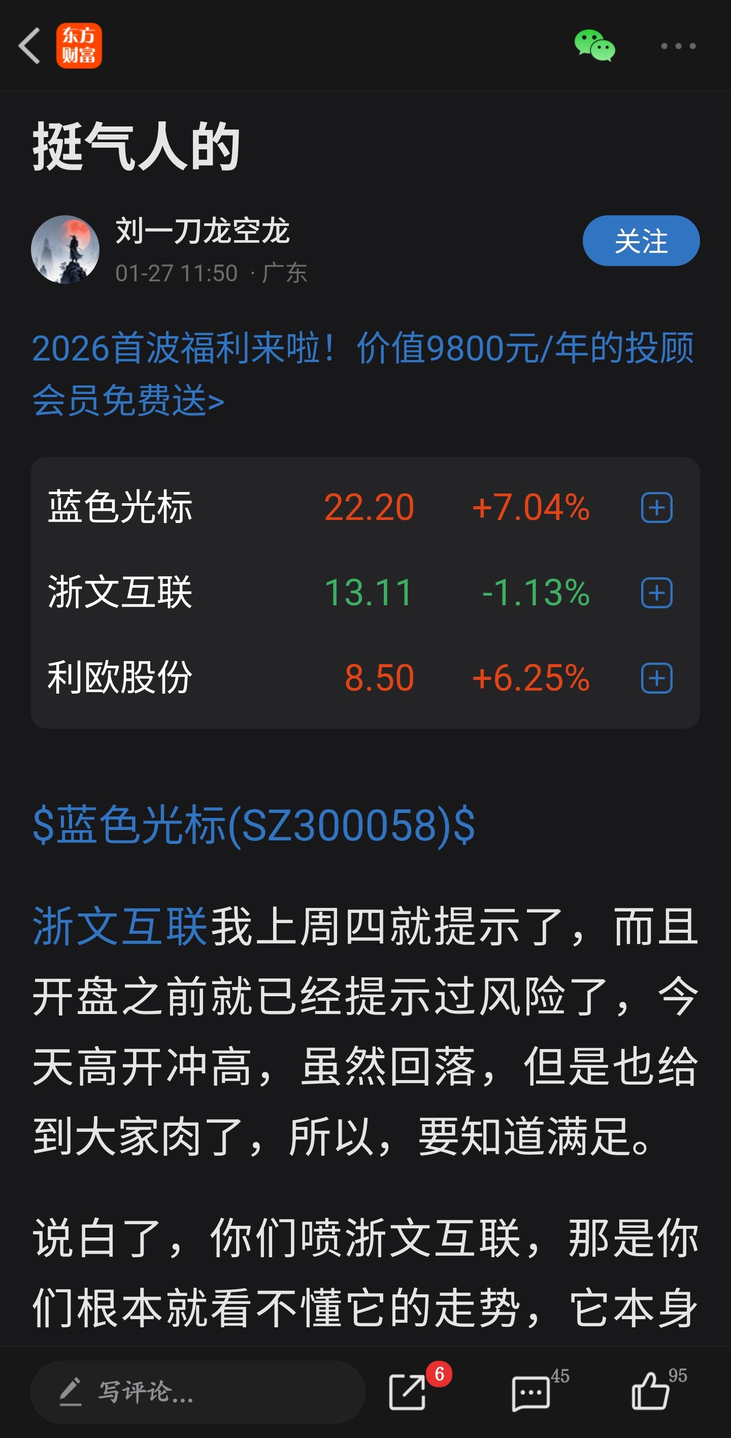 温馨提示: 1.根据《证券法》规定,禁止编造、传播虚假信息或者误导性信息,扰乱证券市场;2.用户在本社区发表的所有资料、言论等仅代表个人观点,与本网站立场无关,不对您构成任何投资建议。用户应基于自己的独立判断,自行决定证券投资并承担相应风险。《东方财富社区管理规定》