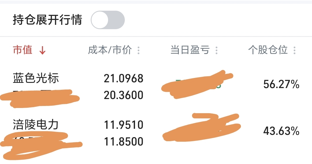 今天早上看蓝色光标出卖点。就立马执行纪律减仓了5成进了电力防守。以为蓝色光标还是