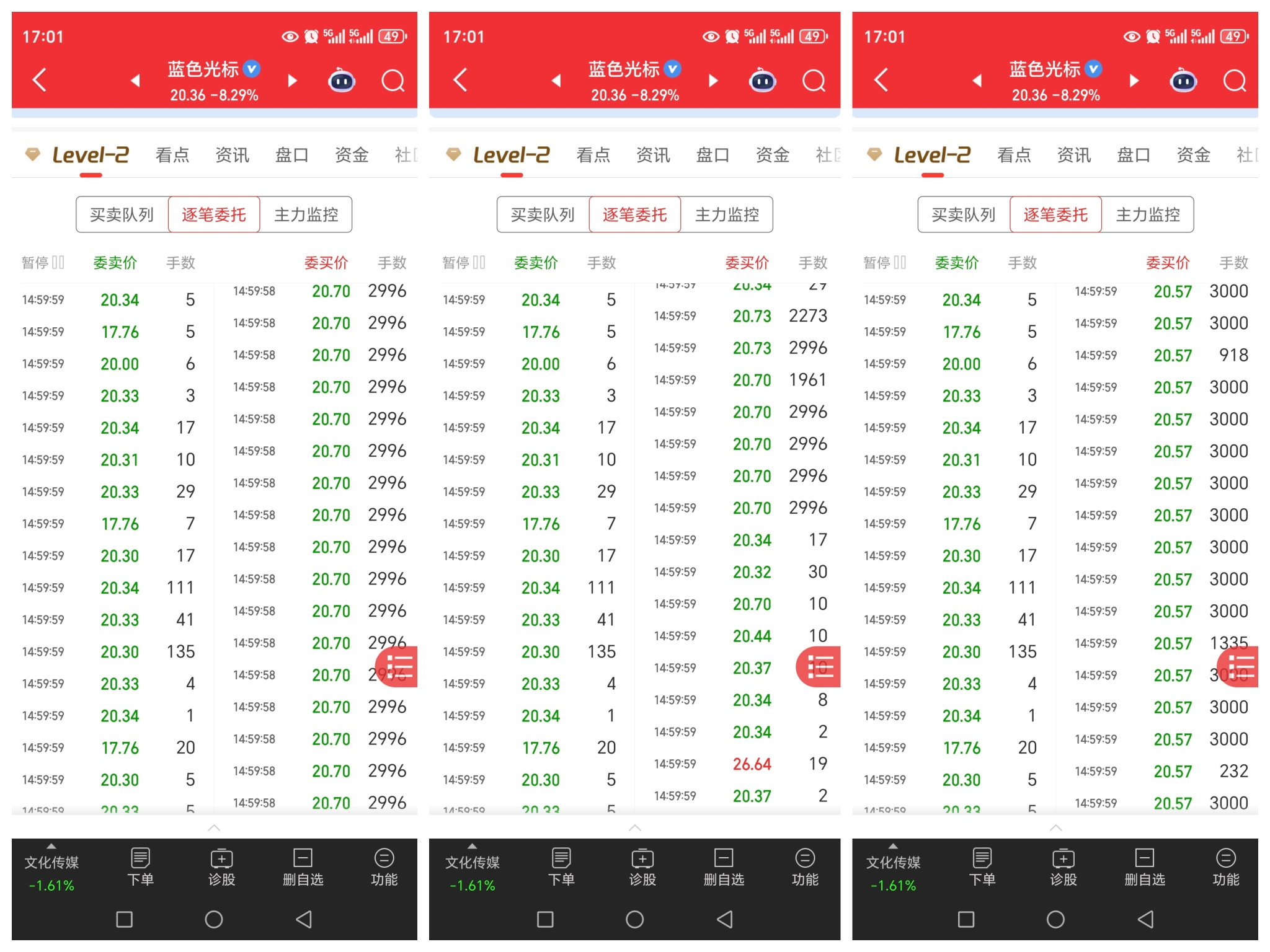 $蓝色光标(SZ300058)$ 怎么解读看自己,我个人看到的卖单全是小单跑路,然后快结束的时候全是大单在买进,创业板最大就是3000手顶满这应该都知道的,要么就是今天主力老哥做了个先手大T,要么就是真有大资金进来抄底看多,至于说什么明天大跌或者大涨,还是得看明天资金的选择,怎么解读完全看自己