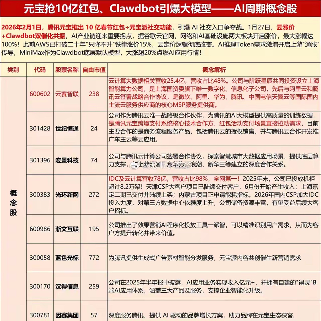 元宝抢10亿红包、Clawdbot引爆大模型-AI周期概念股