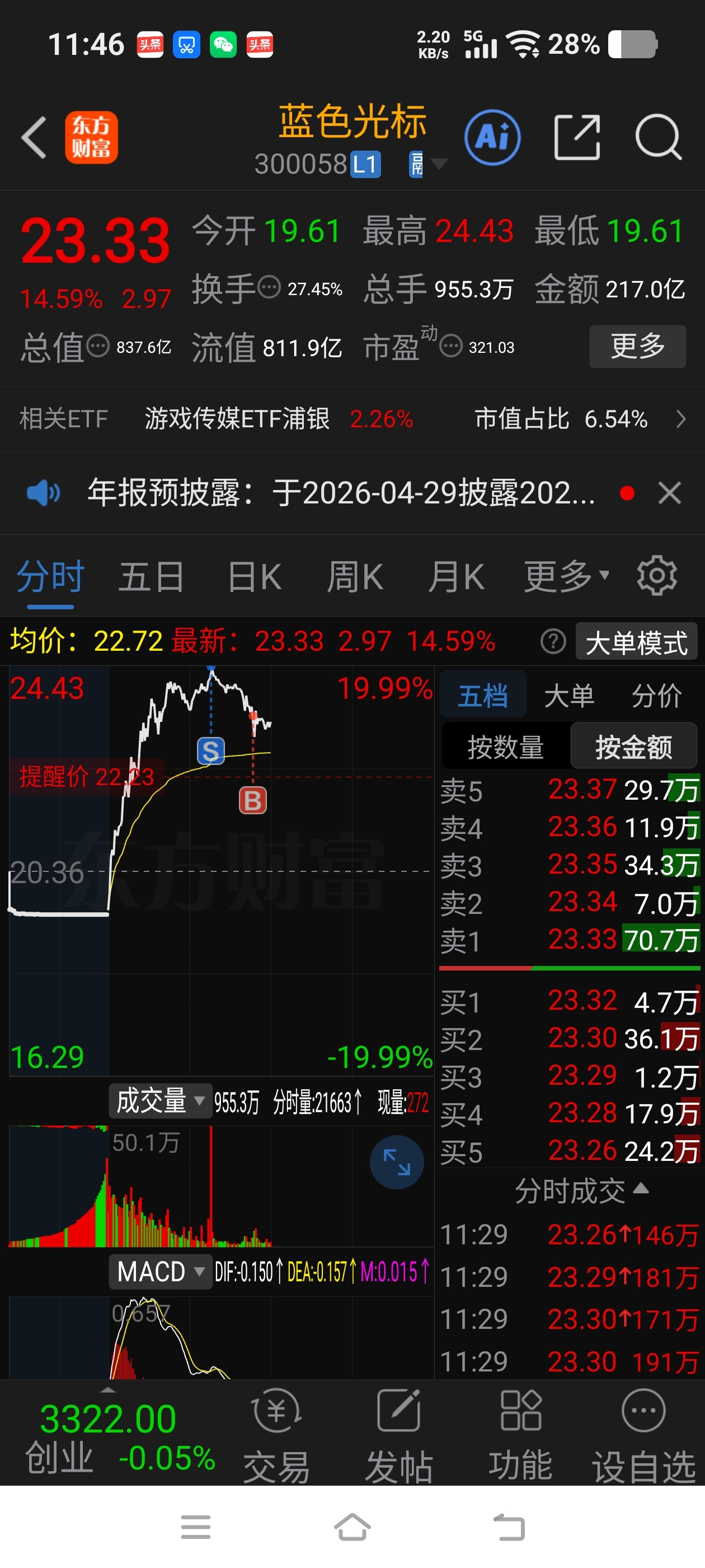 $蓝色光标(SZ300058)$ 上午做个丅,不知下午还有没有机会!