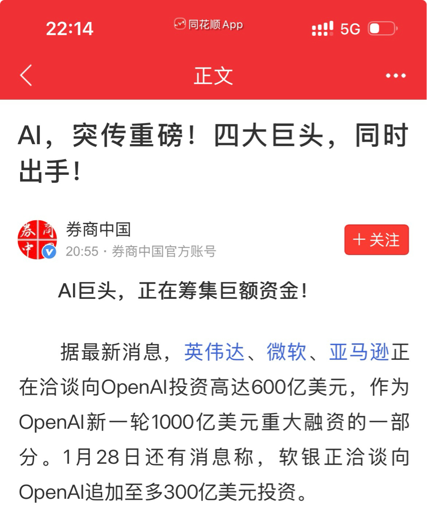 同花顺头条新闻,Ai应用就是2026的趋势,那些唱空者估计今天卖飞了....明天