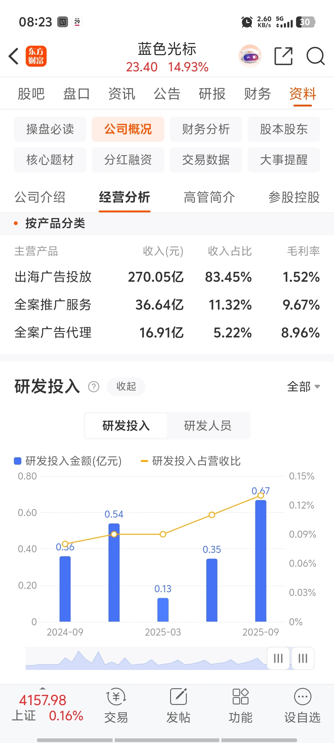 $蓝色光标(SZ300058)$ 涨了挣到钱就落袋为安吧,这家公司非常非常一般(如图),毛利率超低,研发基本没有,根本不是科技公司。今天大概率山顶接盘站岗。