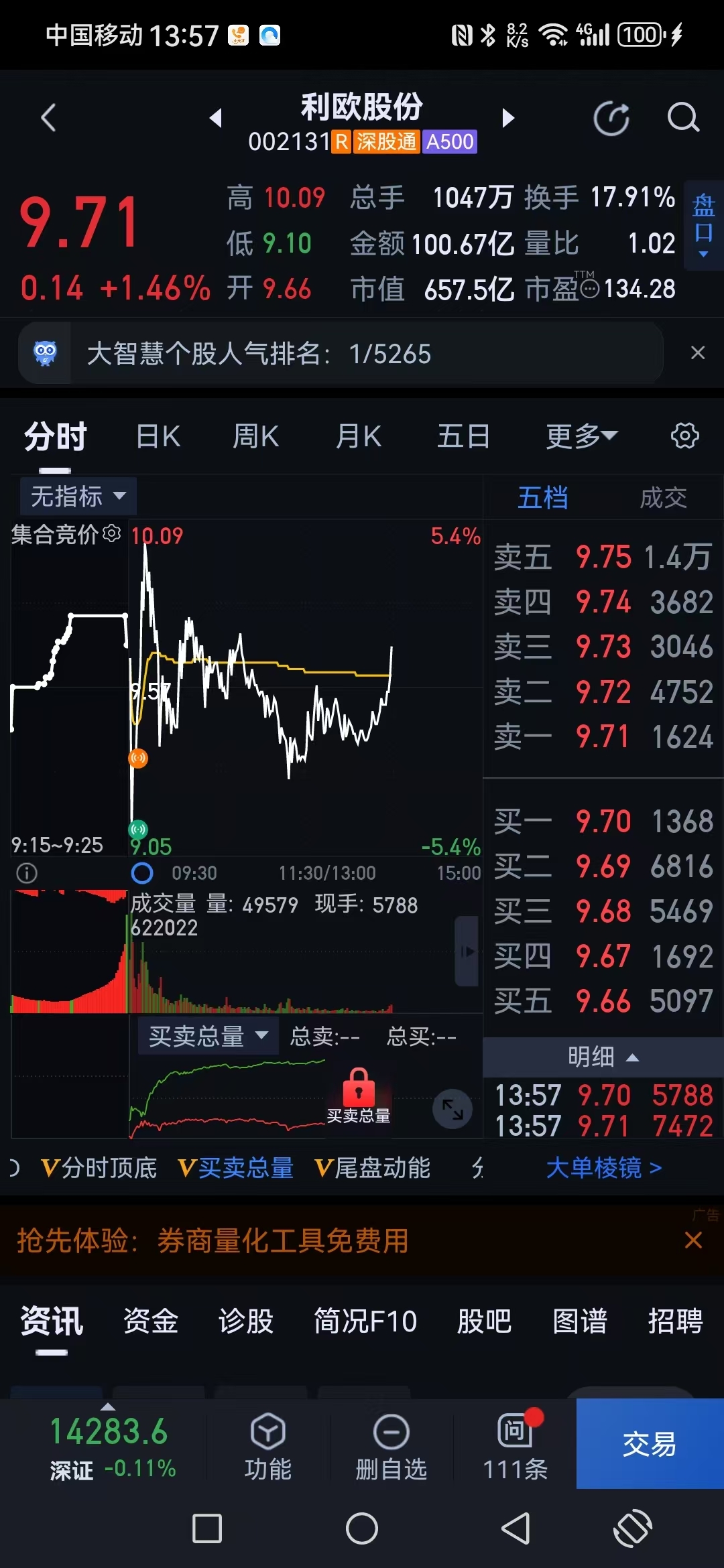 利欧股份最低打到了9.29(雨朦胧吃后最低跌到了9.29)实在是主力吃了货的,主力不拉那主力不大亏吗,这不利欧股份迅速反弹,雨朦胧减少了亏损呢