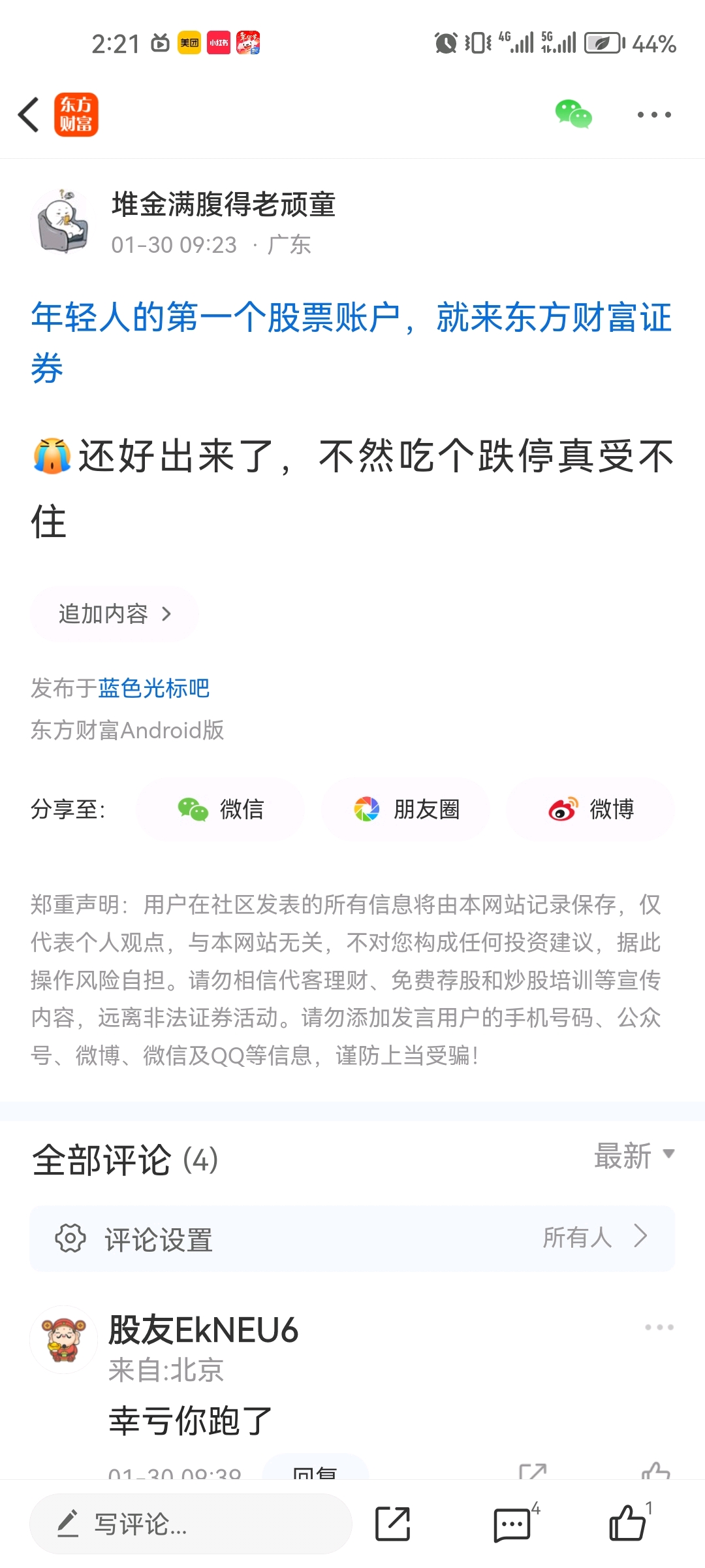 温馨提示: 1.根据《证券法》规定,禁止编造、传播虚假信息或者误导性信息,扰乱证券市场;2.用户在本社区发表的所有资料、言论等仅代表个人观点,与本网站立场无关,不对您构成任何投资建议。用户应基于自己的独立判断,自行决定证券投资并承担相应风险。《东方财富社区管理规定》