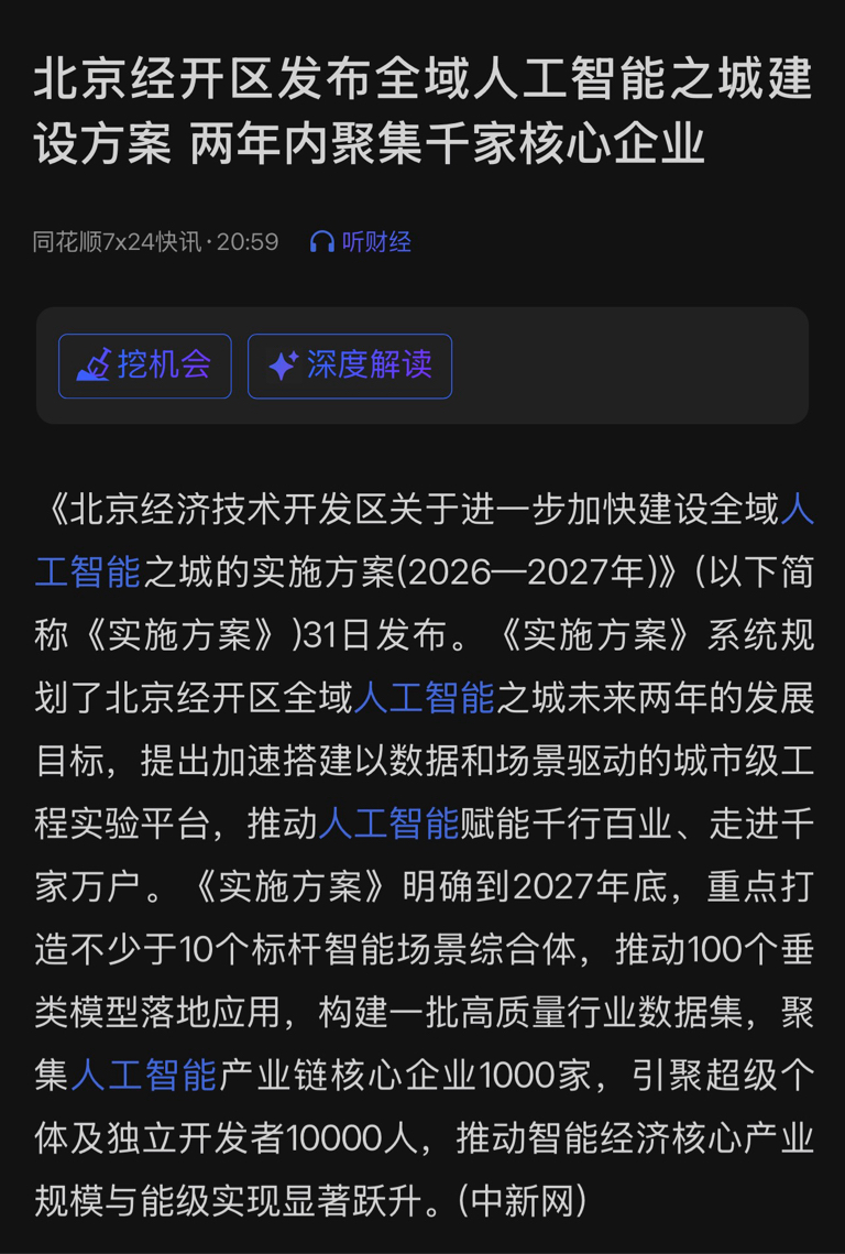 21:12:49【北京经济技术开发区:支持建设6G人工智能实验室等重点机构 搭建6G AI融合测试验证平台】财联社1月31日电,北京经济技术开发区管理委员会印发《关于进一步加快建设全域人工智能之城的实施方案(2026—2027年)》。其中提到,适度超前布局前沿技术。坚持前沿技术与人工智能的双向赋能。推动“量智融合”,建设“量电融合、四算合一”的量子计算基础设施,构建多元计算技术路线的异构概念验证平台,在新材料研发、新能源功率预测等场景中开展仿真验证。强化“6G AI”协同,支持建设6G人工智能实验室等重点机构,搭建6G AI融合测试验证平台,在具身智能、智慧工厂、智慧物流等场景中开展技术验证。探索空天智能基础设施建设,深化通信、遥感、导航等多领域技术与人工智能的协同研发,打造智能高效的新一代空天信息底座。(来自财联社APP)
