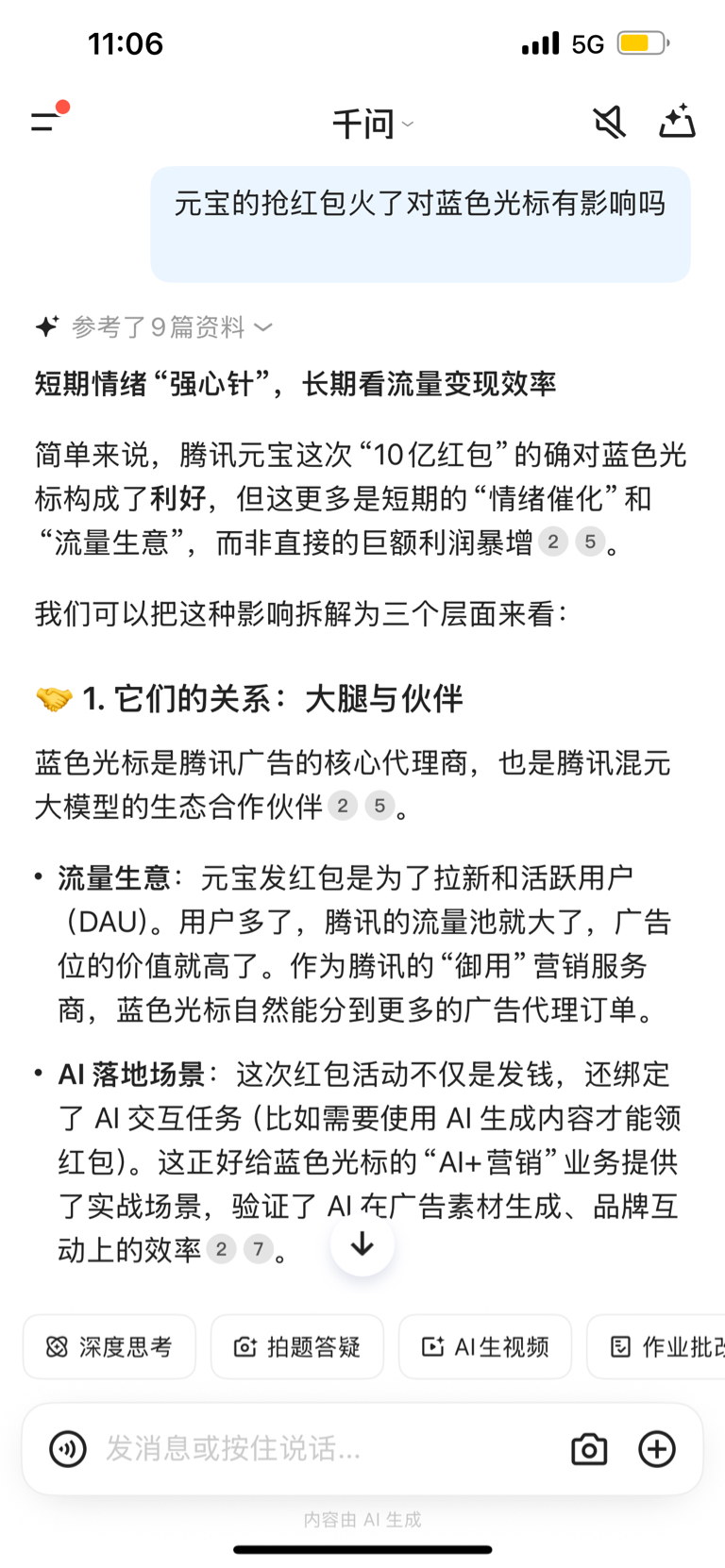 $蓝色光标(SZ300058)$ 中立者千问有一说一