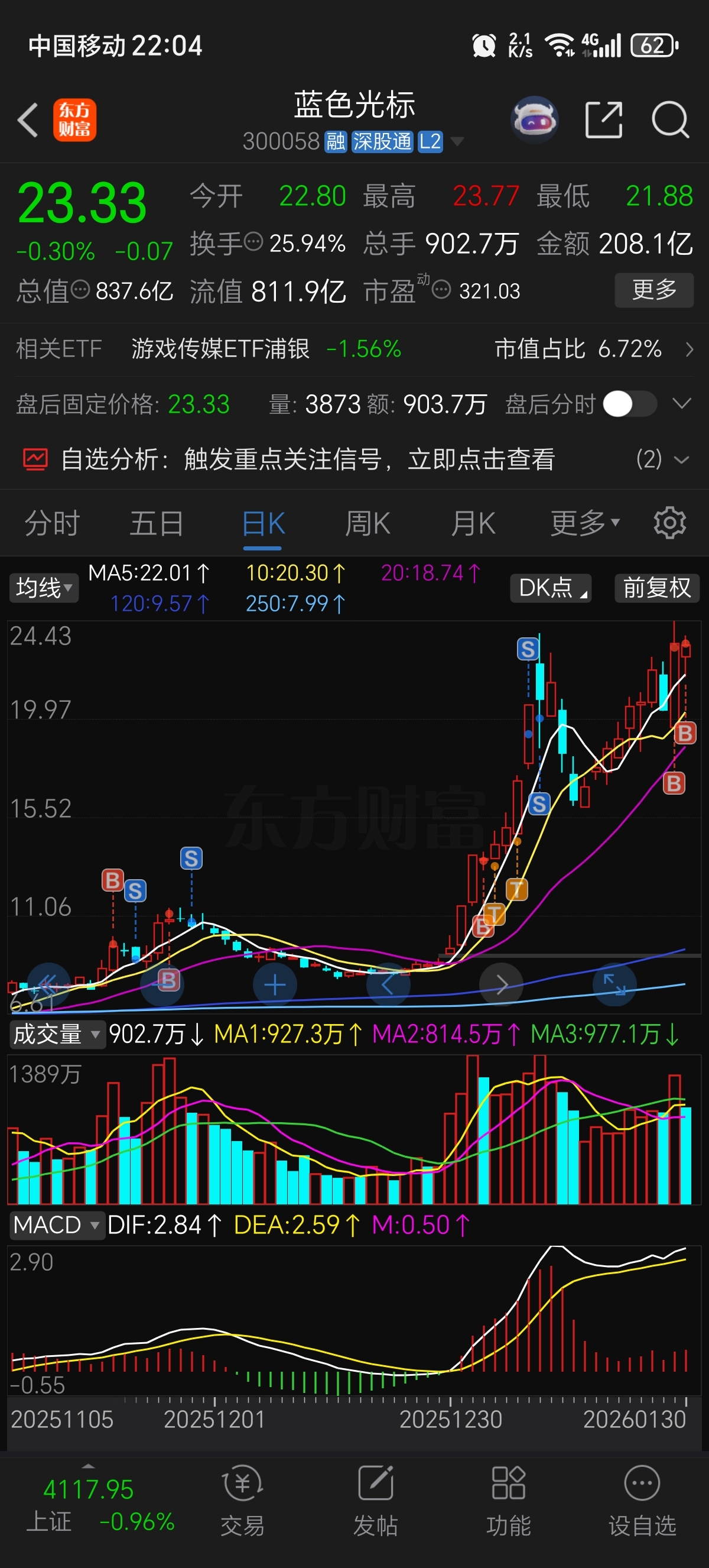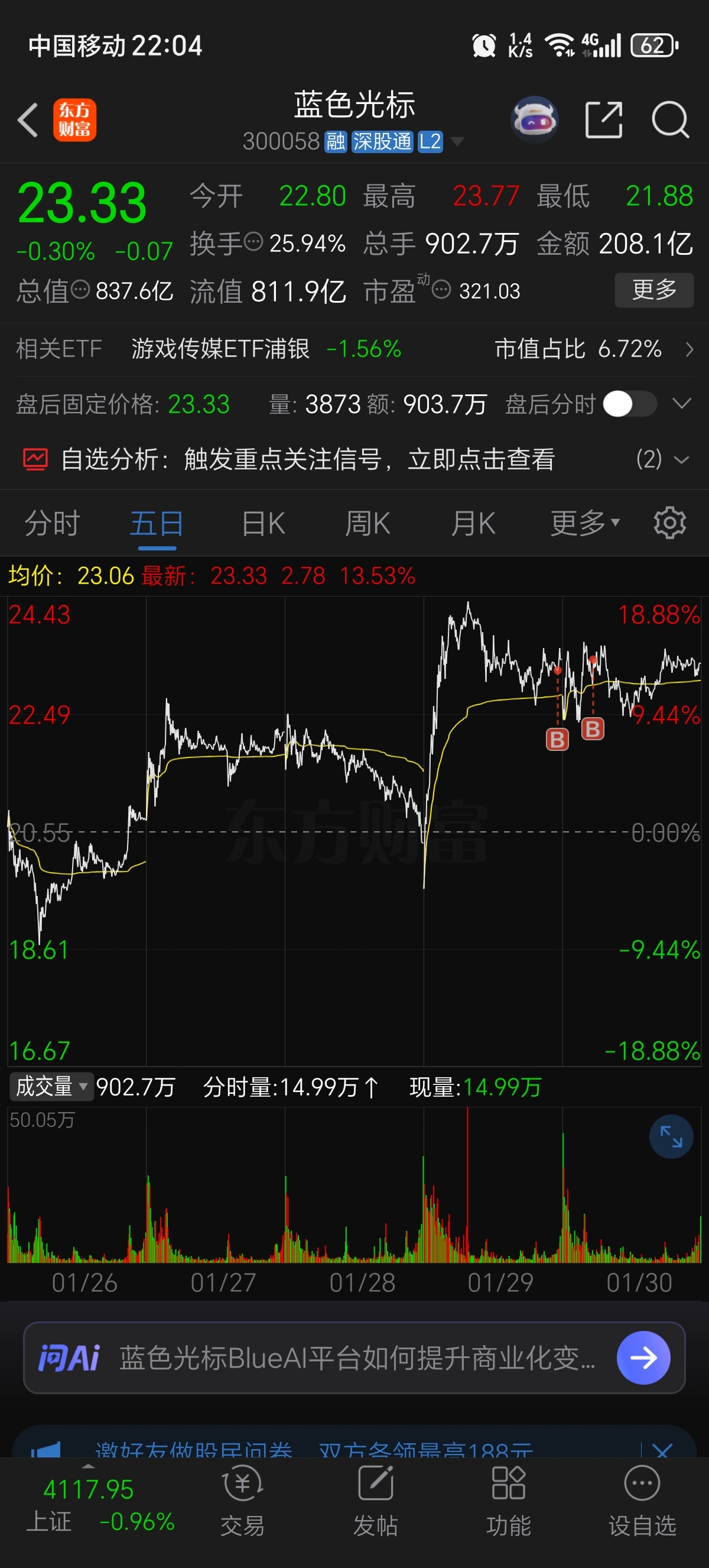 蓝色光标成交量增加,突破了前期高点,周五有点压盘嫌疑,感觉主力不是短期炒作,要是明天起飞,就要炒作一段时间了。