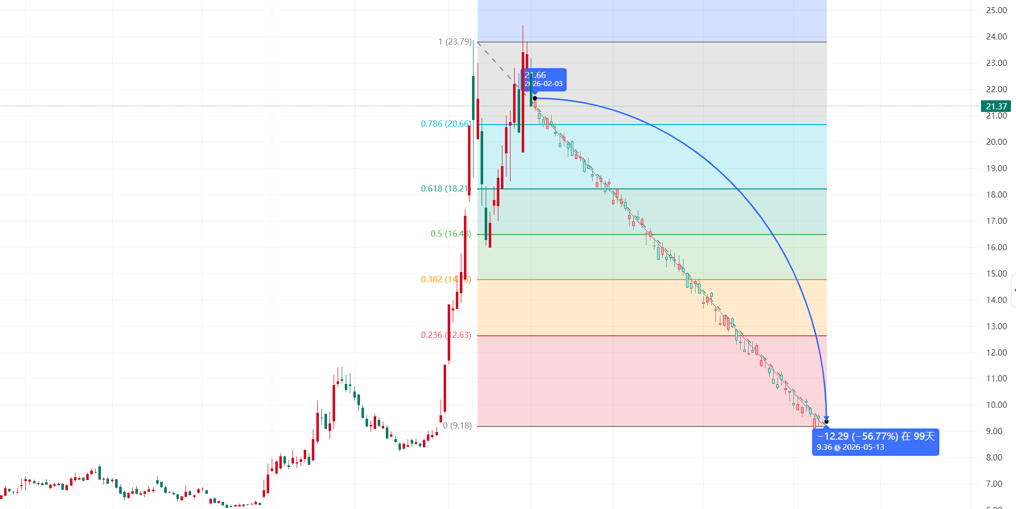 先来看看这走势,简直是教科书级的“见顶回落”。从你们上传的K线图上看,股价从2025年10月的低谷6.08元起步,一路震荡上行,到2026年1月底触及24.43元的高点,看似牛气冲天。但仔细瞧瞧,那根蓝色的均线(可能是MA20)已经死叉向下,橙色的趋势线也被无情击穿,MACD指标绿柱拉长,RSI超卖区徘徊。更可怕的是成交量:最近几天放量下跌,今天成交换手776.79万手,换手率高达35.90%!这意味着什么?机构和大户在高位出逃,小散户在接盘。图表下方那密密麻麻的红绿柱子,显示从2025年12月到2026年2月的成交量急剧放大,但股价却从高点直线下挫8.06%。这不是简单的回调,这是破位杀跌的信号!如果支撑位21.30元守不住,下一个目标就是回探15元,甚至更低。股东们,你们还敢赌吗?醒醒吧,这走势像极了2022年那些“元宇宙概念股”的崩盘前夜,历史总是惊人地相似。