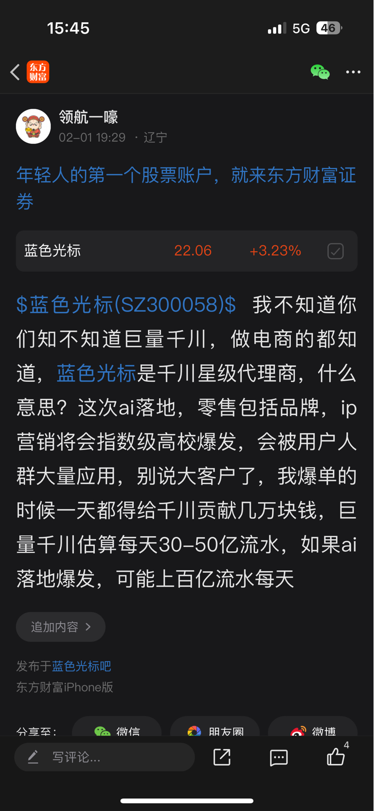 温馨提示: 1.根据《证券法》规定,禁止编造、传播虚假信息或者误导性信息,扰乱证券市场;2.用户在本社区发表的所有资料、言论等仅代表个人观点,与本网站立场无关,不对您构成任何投资建议。用户应基于自己的独立判断,自行决定证券投资并承担相应风险。《东方财富社区管理规定》