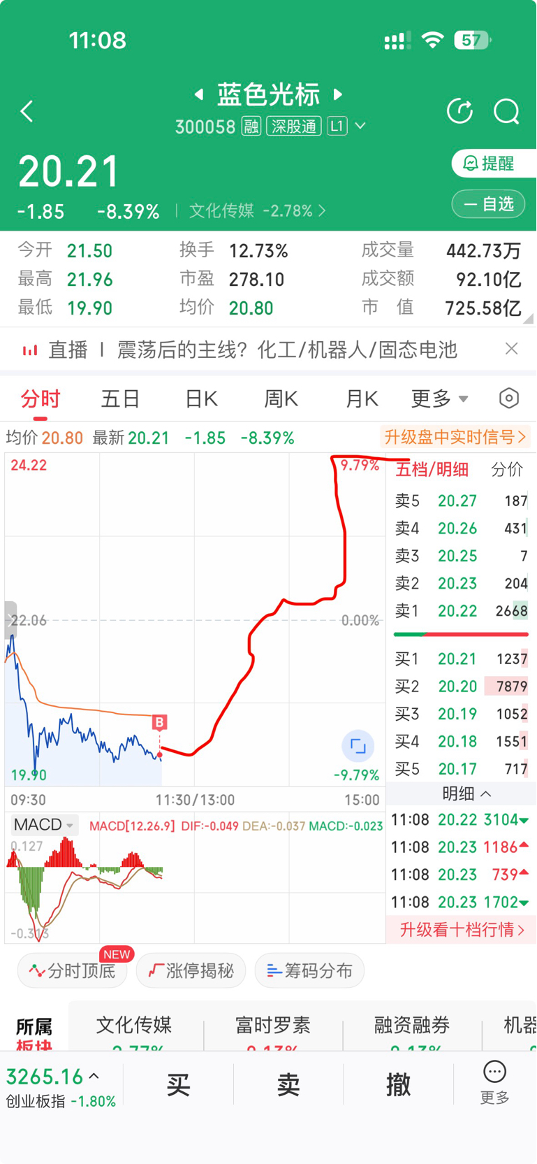 $蓝色光标(SZ300058)$ 越跌越补,长线持有,目标五十。今日后续分时图我给大家画出来了