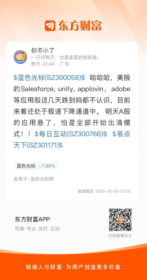 $蓝色光标(SZ300058)$ 哈哈哈,美股的Salesforce, unity, applovin,adobe等应用股这几天跌到妈都不认识,目前来看还处于极速下降通道中。 明天A股的应用悬了,怕是全部开始出清模式!!$每日互动(SZ300766)$ $易点天下(SZ301171)$